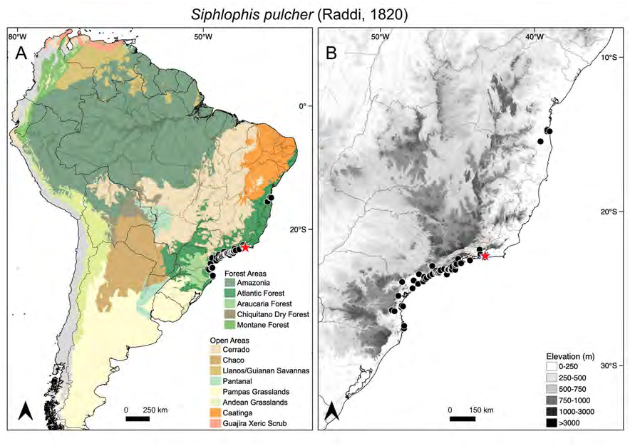 Plate 342. Distribution map of Siphlophis pulcher in relation to (A) South American Ecoregions (adapted from Olson et al., 2001) and (B) elevation. Red star indicates type-locality, if precisely located.