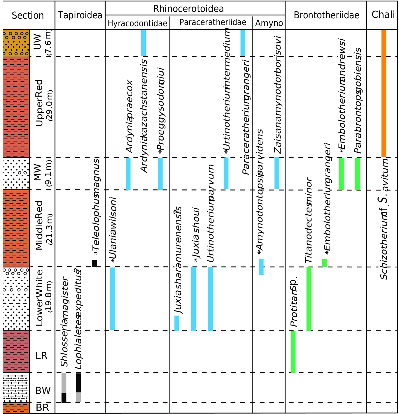 FIG. 10. Stratigraphic distributions of perissodactyl fossils and taxa from Erden Obo. The profile of section is based on the sketch by Granger (1928) and modified from Li (2017). The asterisks in front of taxa indicate where the holotype occurred in the section. Abbreviations: Amyno., Amynodontidae; BR, Basal Red; BW, Basal White; Chali., Chalicotherioidea; LR, Lower Red; MW, Middle White; and UW, Upper White.