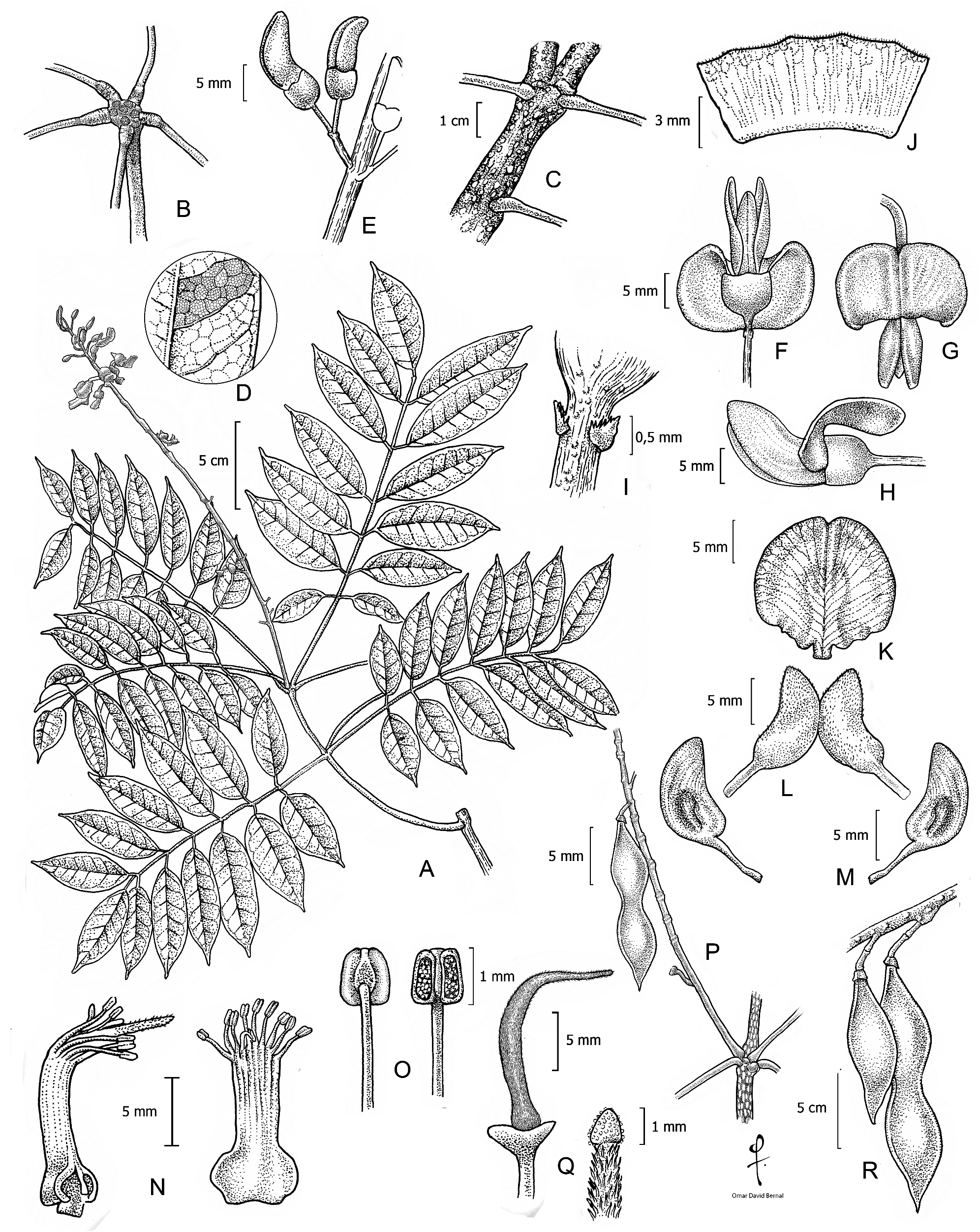 FIGURE 1. Illustration of Lonchocarpus verticillatus A. Terminal branch with the arrangement of leaves and inflorescence. B. Branch showing the whorled arrangement of the leaves. C. Lenticels on branches. D. Detail of the venation in the intercostal space in abaxial view. E. Detail of pseudoracemose inflorescence with a pair of pedicellate flowers at the end of a short peduncle or brachyblast which form a "Y". F. Ventral view of flower at anthesis. G. Dorsal view of flower. H. Lateral view of flower with standard petal reflexed. I. Detail of bracteoles in the subapical segment of the pedicel. J. Calyx open adaxial surface. K. Standard. L. keel petals partially attached. M. wings. N. Staminal tube with callosities at the base (left) and tube open view inner surface (right). O. Anthers dorsal (left) and ventral (right) views. P. Gynoecium with stigma detail, Q. Infructescence. R. Fruits. A–P based on C. Rivera et al 1370; Q–R based on W. Ariza-C. et al. 9523. Illustration by Omar Bernal.