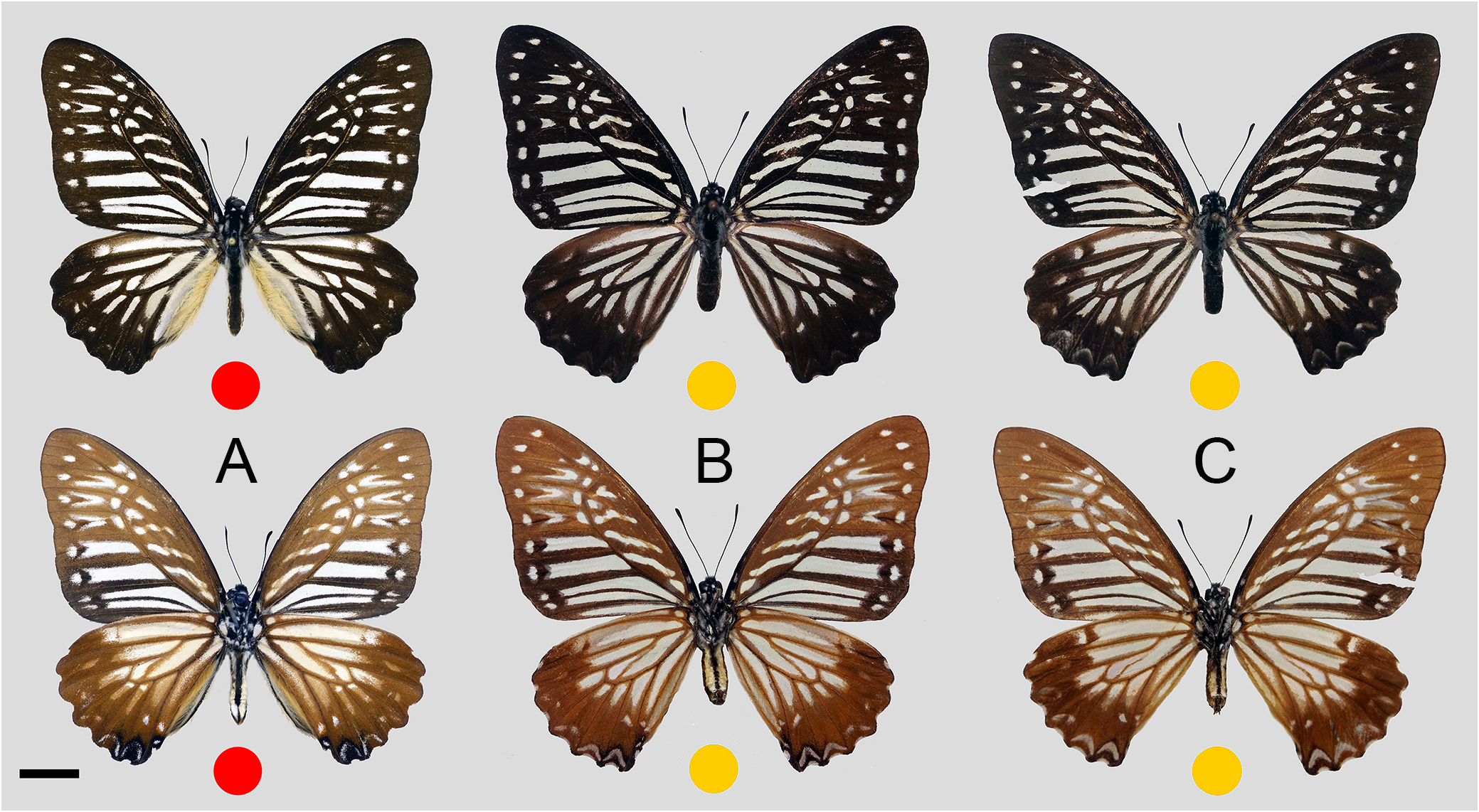 FIGURE 5. Types of Graphium macareus vadimi Cotton & Hu ssp. nov.; upperside on the first row, underside on the second row; A: holotype, ♂, B and C: paratypes, ♀; scale bar = 10 mm.