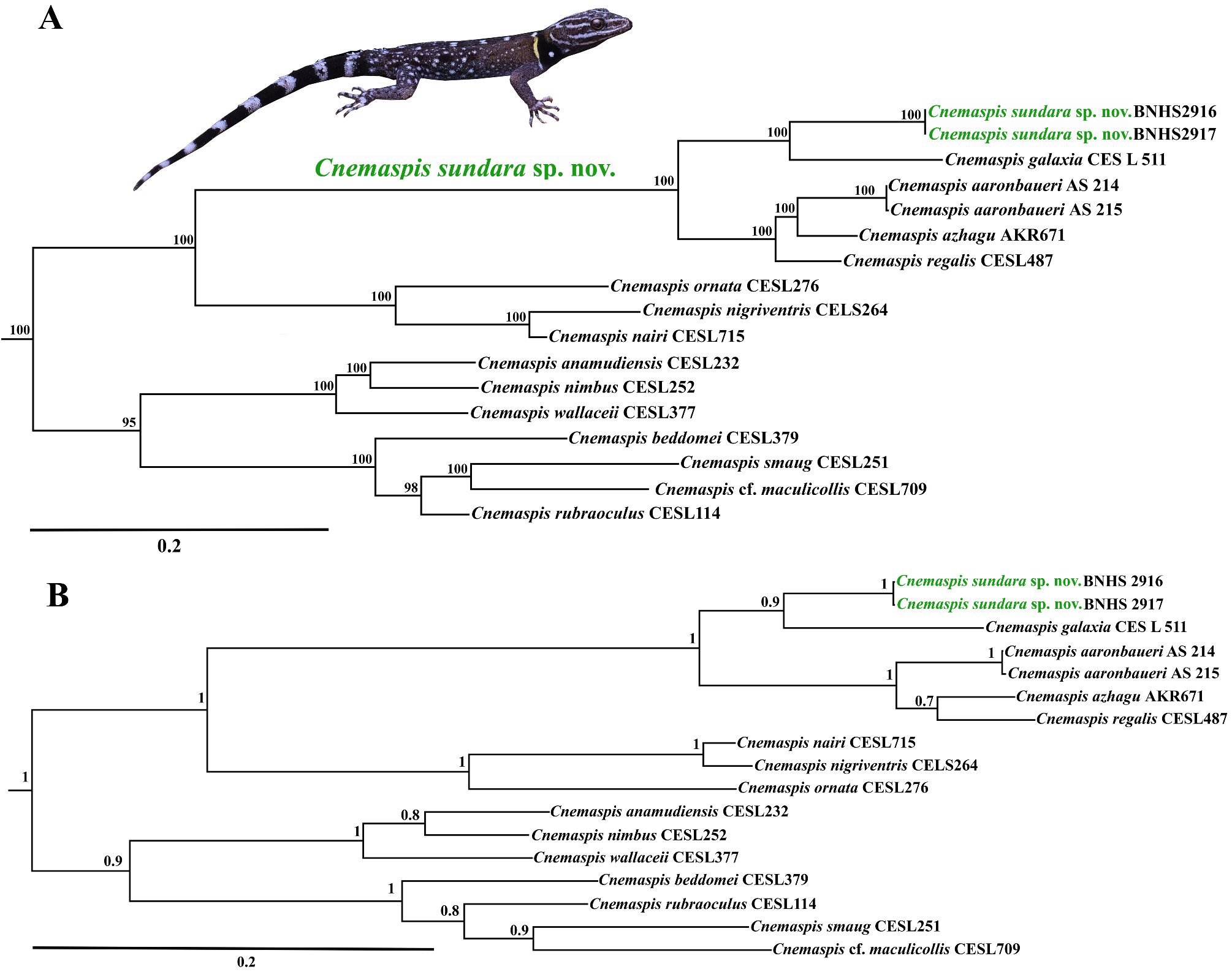 FIGURE 12. Phylogenetic trees showing the relationships among the species of the Cnemaspis beddomei clade. Maximum Likelihood phylogenetic tree (A). Values along the nodes are ultrafast bootstraps for 1000 iterations. Bayesian phylogenetic tree (B). Values along the nodes indicate the Bayesian posterior probabilities. The lineage in bold green indicates the new species.