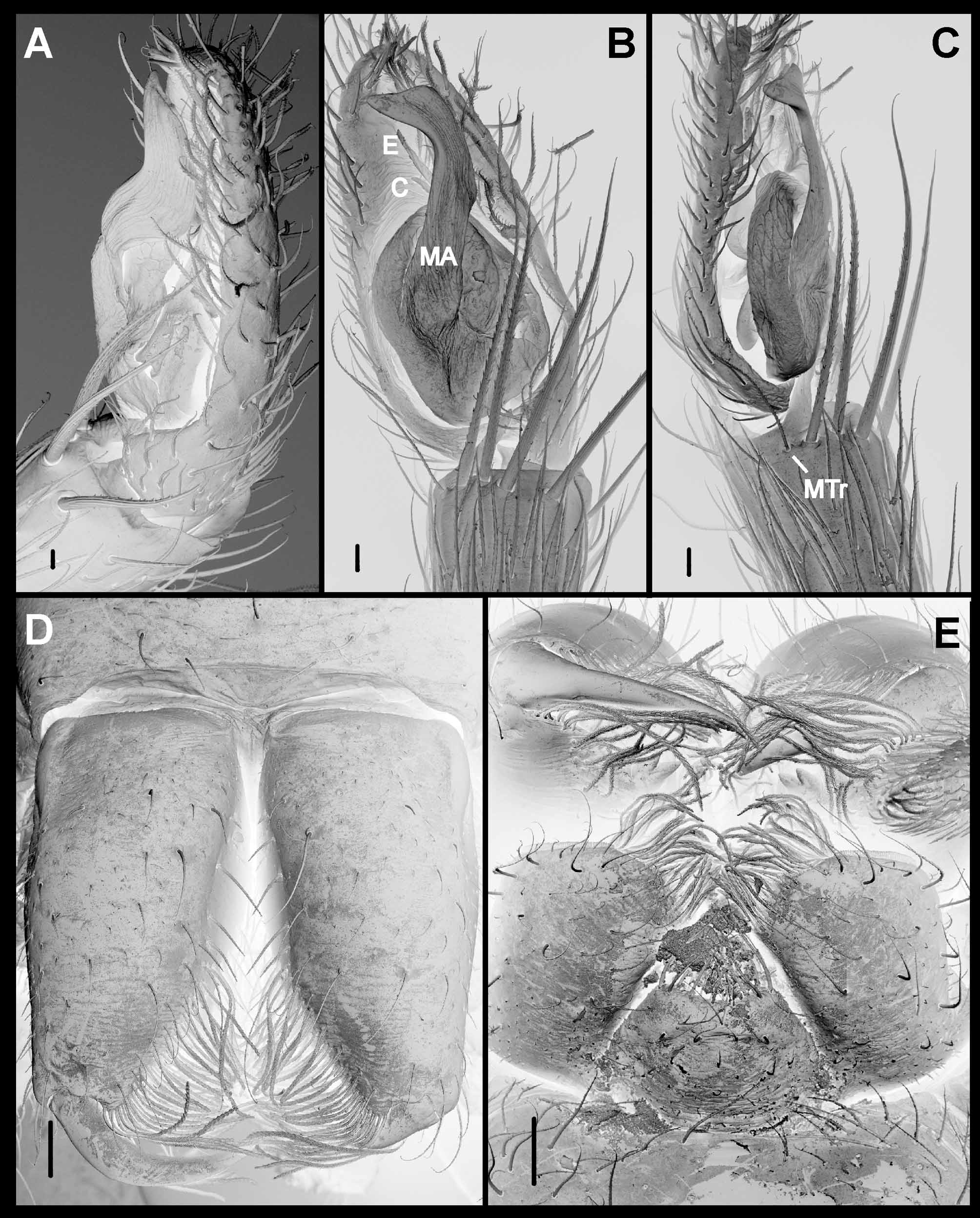 FIGURE 36. Scanning electron micrographs of Epidius parvati (MHNG). A–C, right male palp (A prolateral, B ventral, Cretrolateral); D Chelicerae, frontal view; E labium and maxillae, ventral view. Scale bars = 10 µm (A), 20 µm (B, C), 100 µm (D, E).