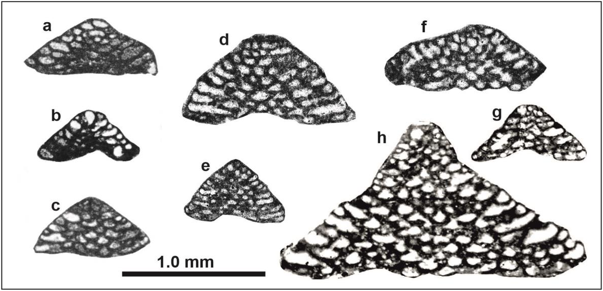 Fig. 2. Orbitolinopsis nikolovi Peybernès et al. (a-c; interpreted as juvenile specimens; a = holotype, early Aptian of Bulgaria), a subjective junior synonym of Orbitolinopsis buccifer Arnaud-Vanneau & Thieuloy (e-f, upper Berriasian of eastern Serbia, see Bucur et al., 2020; g-h, unpublished specimens from the Lower Cretaceous of southeastern France; leg. B. Clavel; note adult specimen in h).