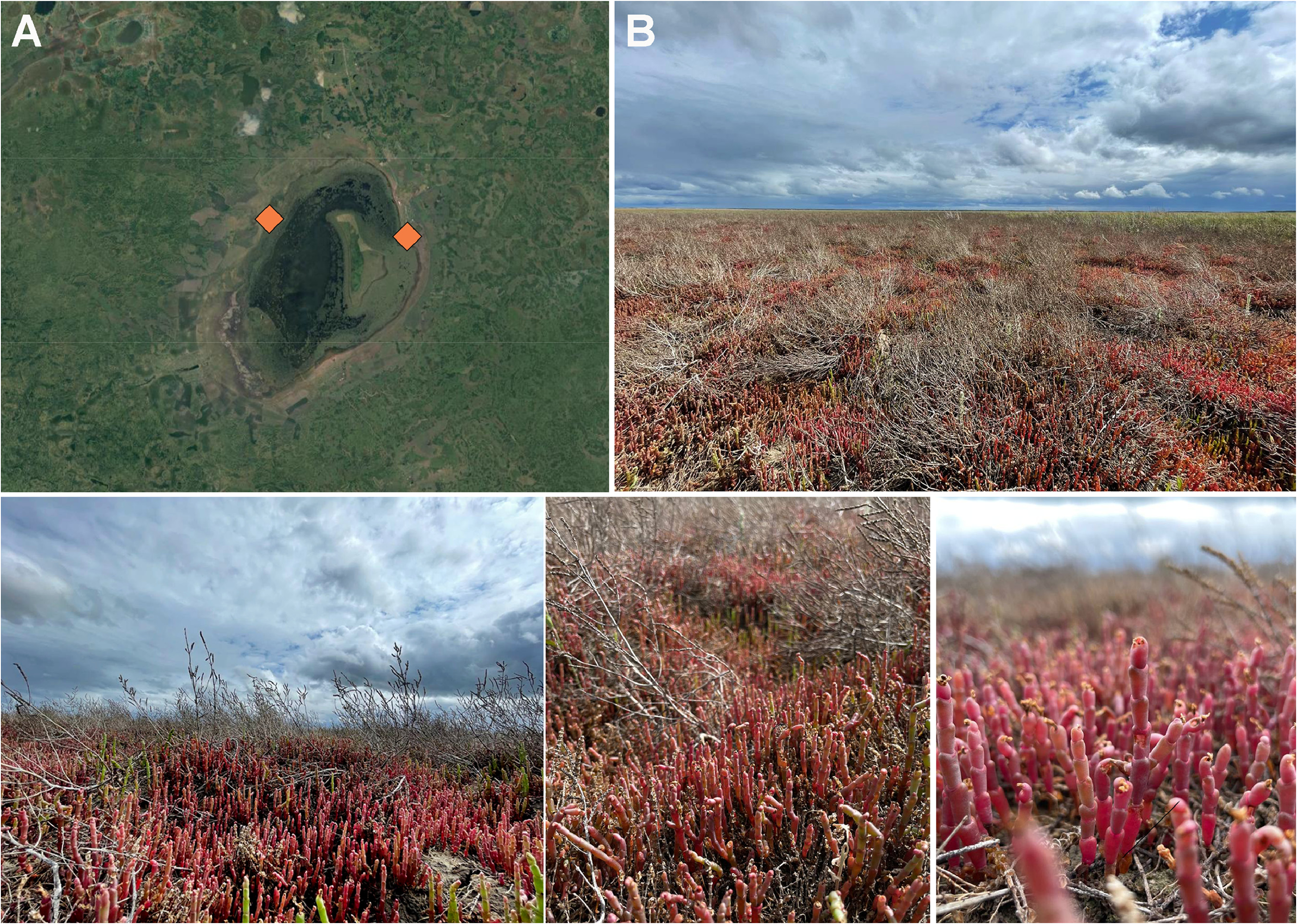 FIGURE 2. Tavolzhan salt lake. A: satellite image, orange dots indicate localities where the type specimens were collected; B and bottom row: lake shore with Salicornia sp.