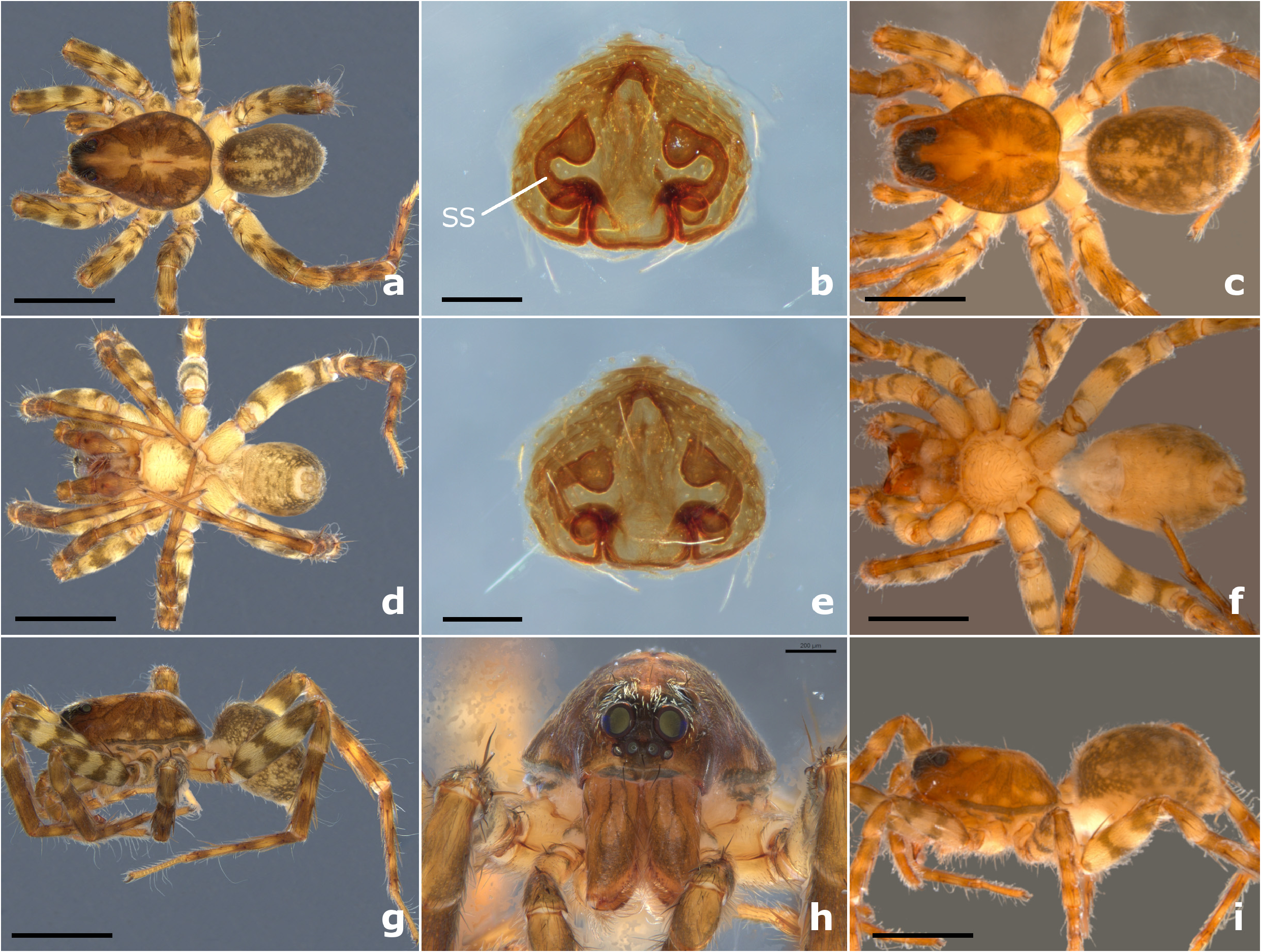 FIGURE 20. Arctosa jibarosa sp. nov. Male habitus (MUSM-ENT 504111) a, d, g–h (a, dorsal; d, ventral; g, lateral; h, frontal). Epigynum (MUSM-ENT 504111) b, e (b, dorsal; e, ventral). Female habitus paratype (MUSM-ENT 505269) c, f, i (c, dorsal; f, ventral; i, lateral). Scale bars: a, d, g, 1 mm, b, e, 0.1 mm, h, 200 µm, c, f, i, 1 mm. SS stalk of spermatheca.