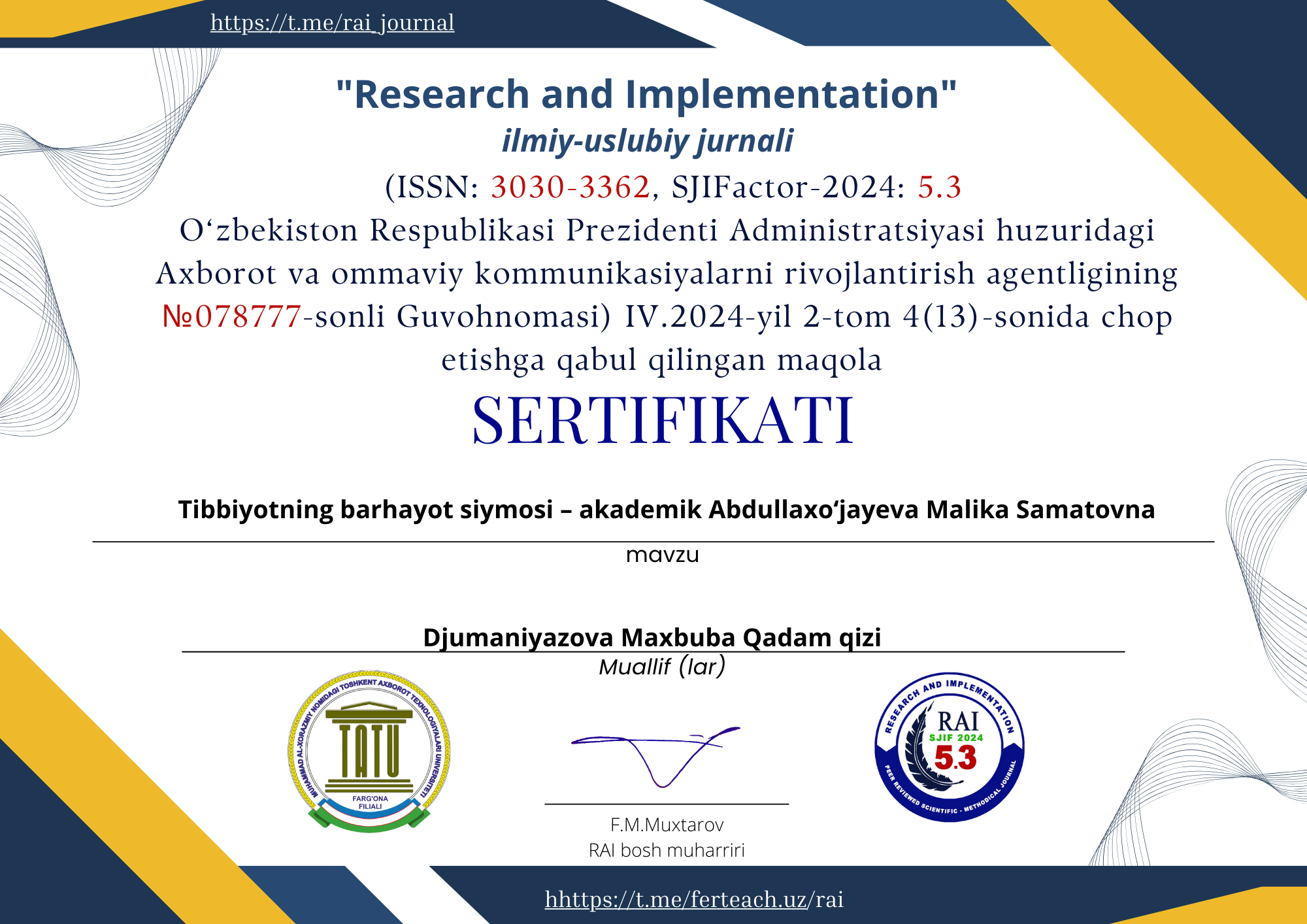 The article tells about the life and scientific research of Abdullahodjaeva Malika Samatov, a living figure in medicine, Hero of Uzbekistan, Honored Scientist of Uzbekistan, Academician of the Academy of Sciences of the Republic of Uzbekistan, Doctor of Medical Sciences, Professor. coated