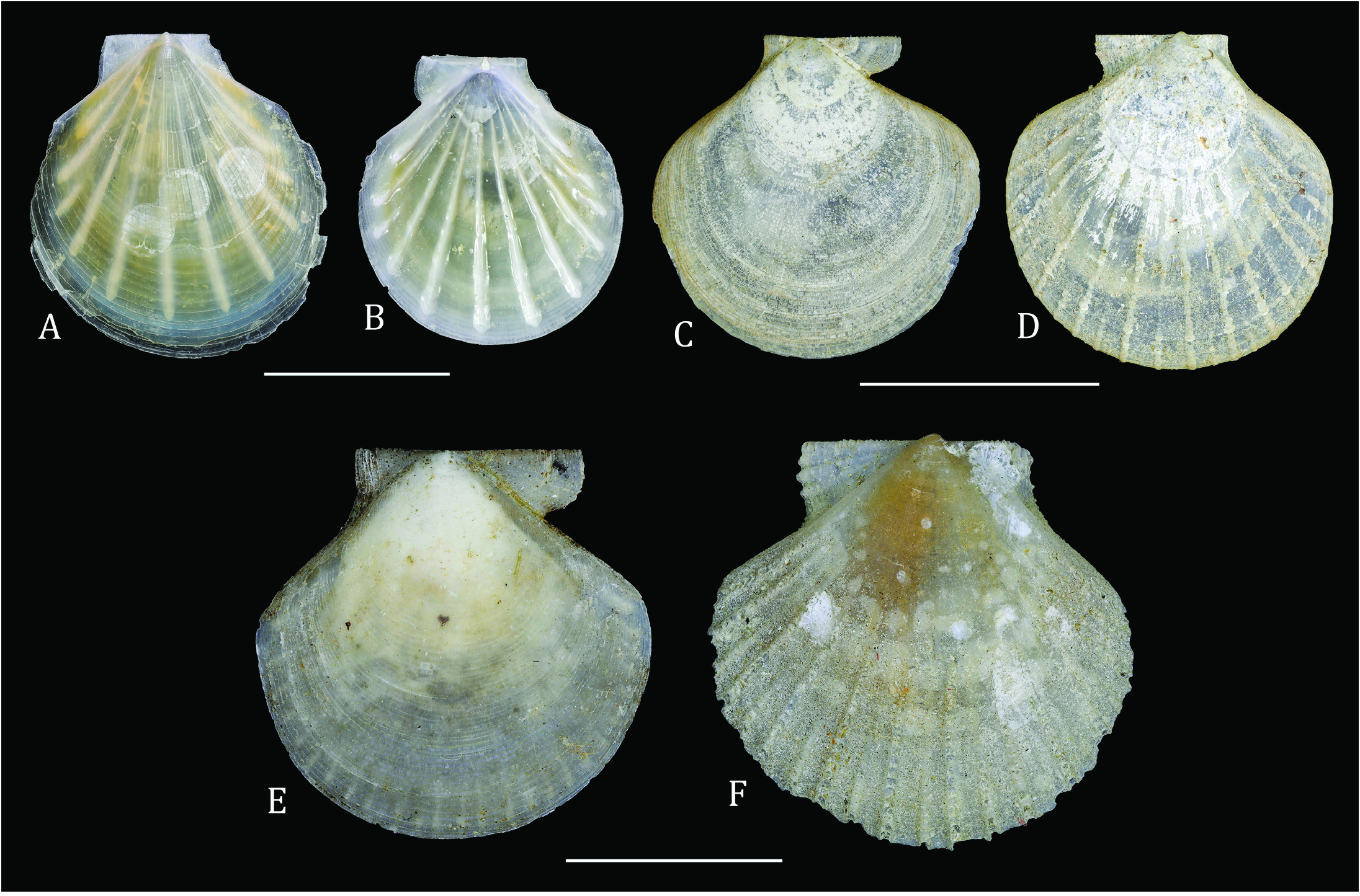 Figure 20. Variation in shell morphology in living North Pacific Propeamussiidae. A, B. Right and left valves of Propeamussium jeffreysi (E.A. Smith, 1885), SBMNH 126833. C, D. Right and left valves of Cyclopecten davidsoni (Dall, 1898), SBMNH 123955. E, F. Right and left valves of Parvamussium alaskense (Dall, 1871), SBMNH 103661. Scale bars=1 cm.
