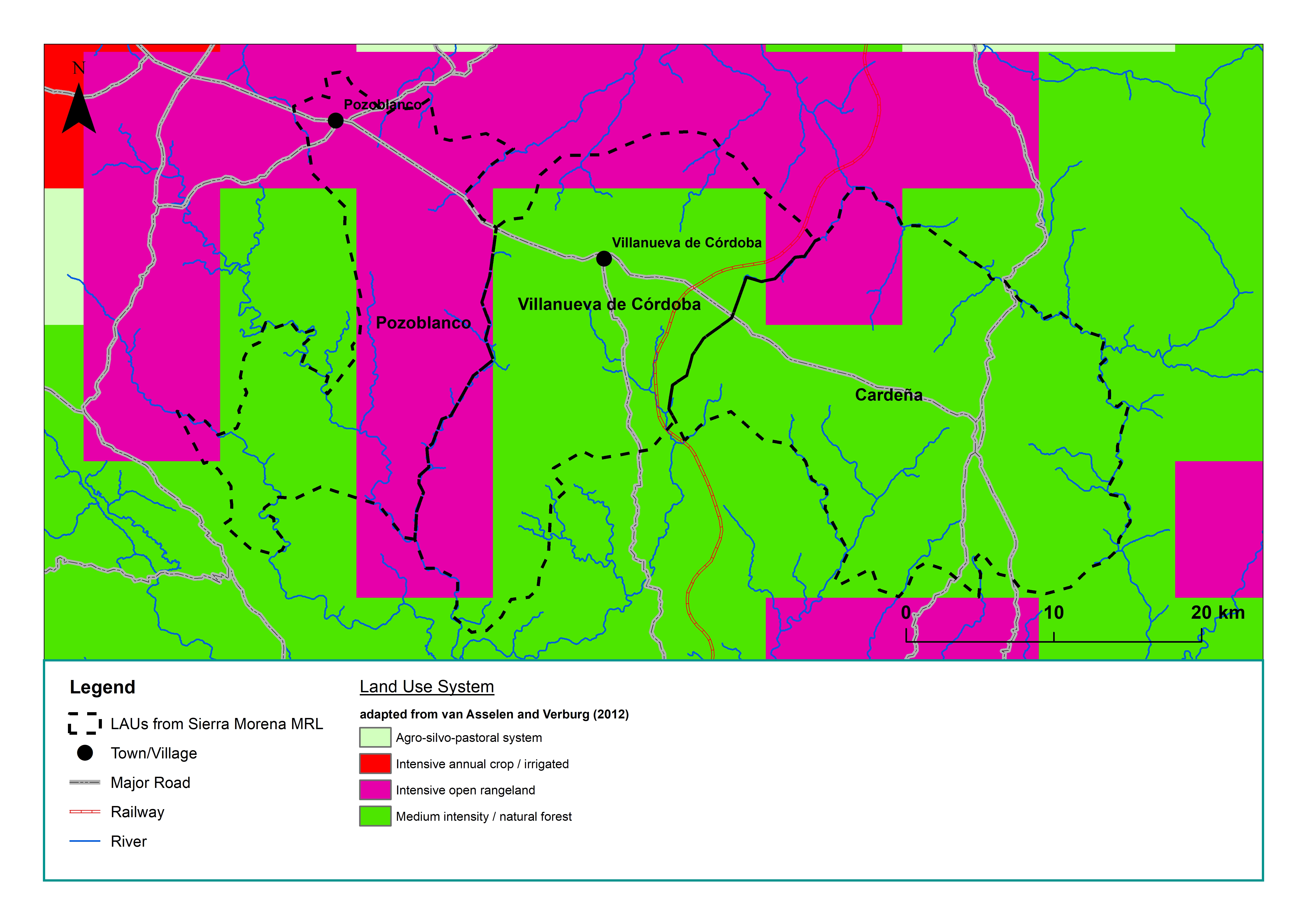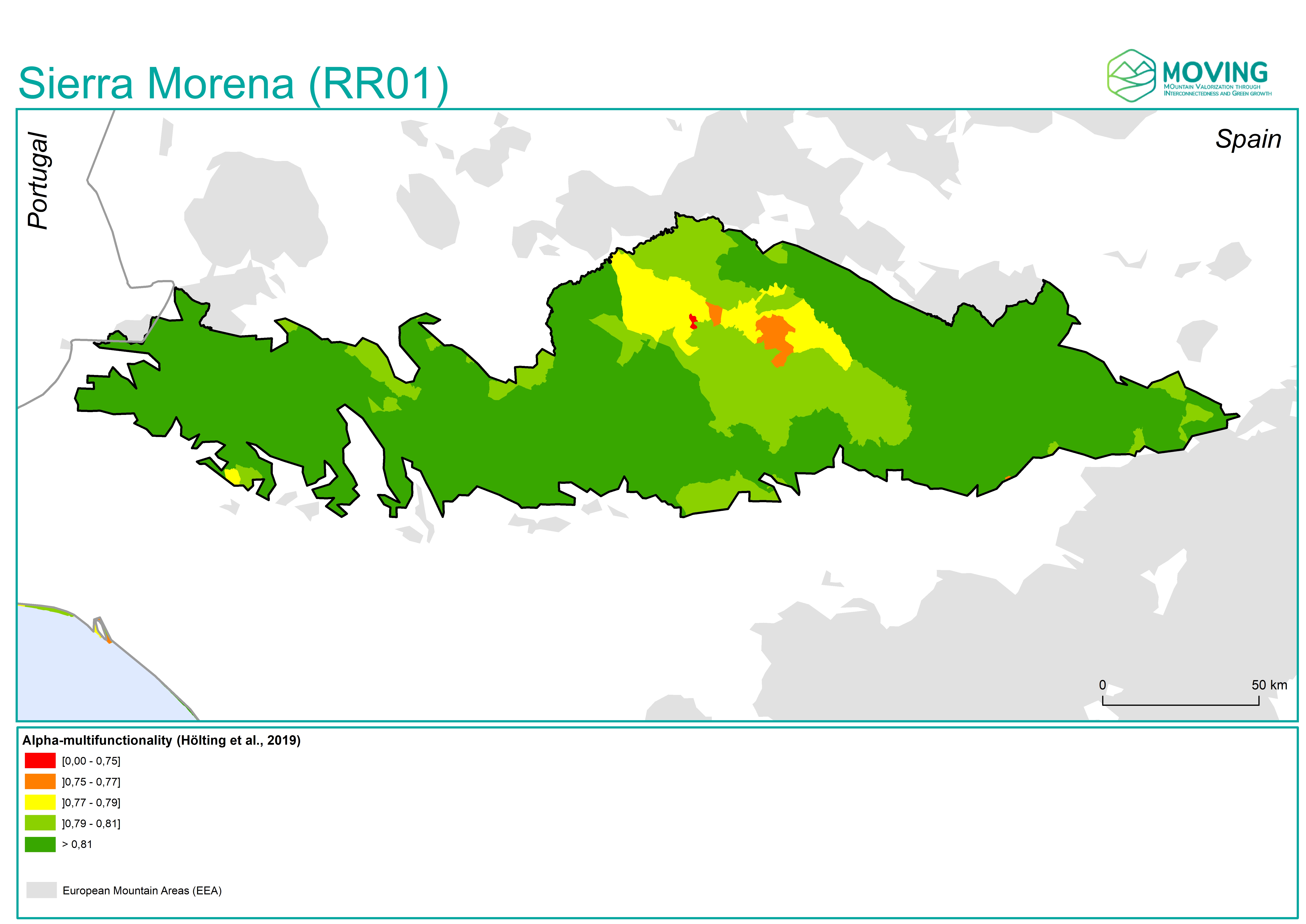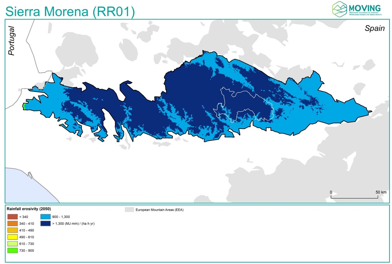 The MOVING project has developed accessible tools designed to assess susceptibility and vulnerability within the region, ready to be used by both experts and the general audience. This document synthesises crucial information for the Sierra Morena Region, particularly focusing on the Participatory Vulnerability Matrix and the Spatial Vulnerability Map. Furthermore, it includes supplementary maps and figures detailing various aspects such as the delineation of Reference Landscape, distribution of land systems, areas affected by wildfires, susceptibility to floods across different return periods, severity of forest disturbances, rainfall erosivity, and more.