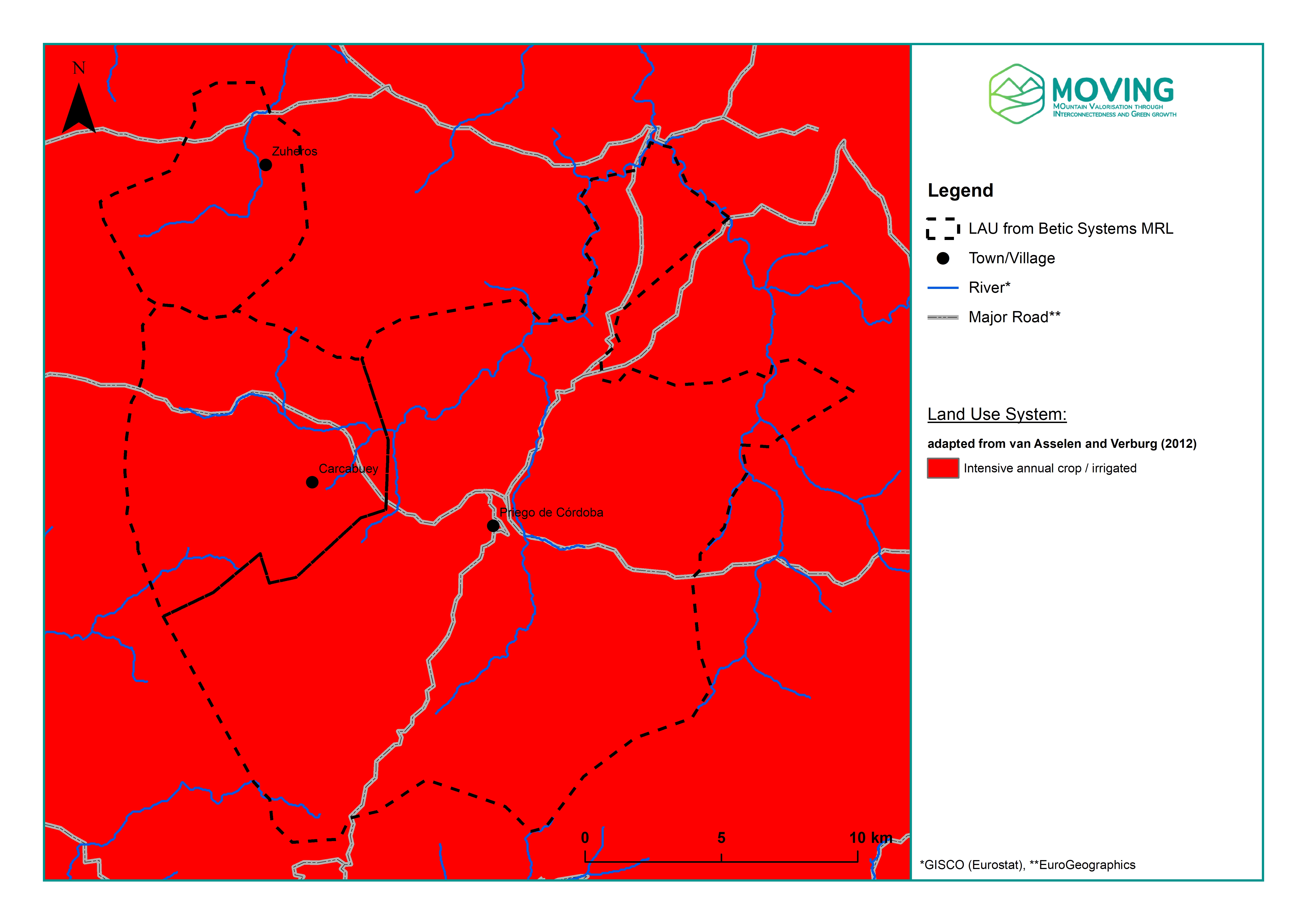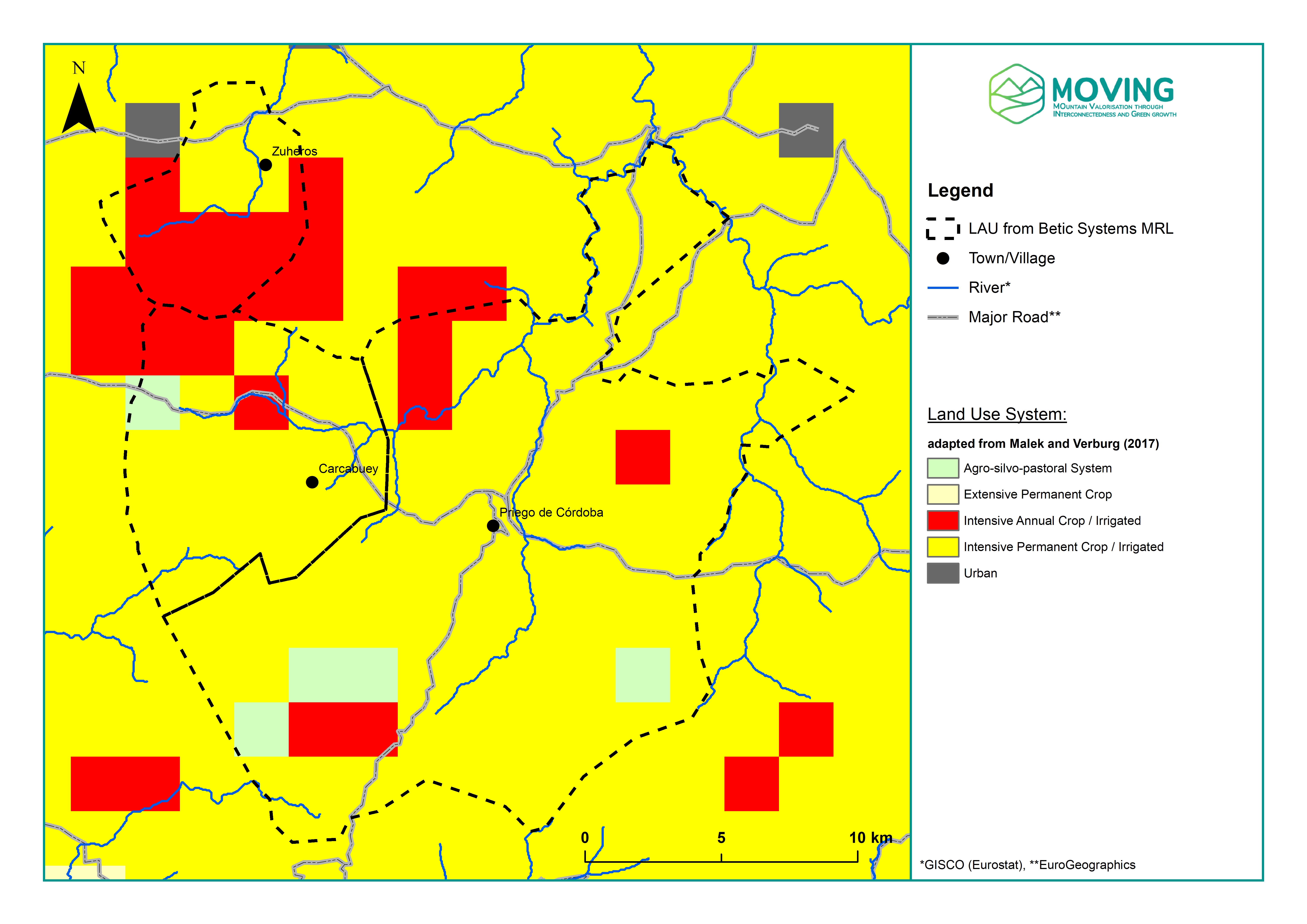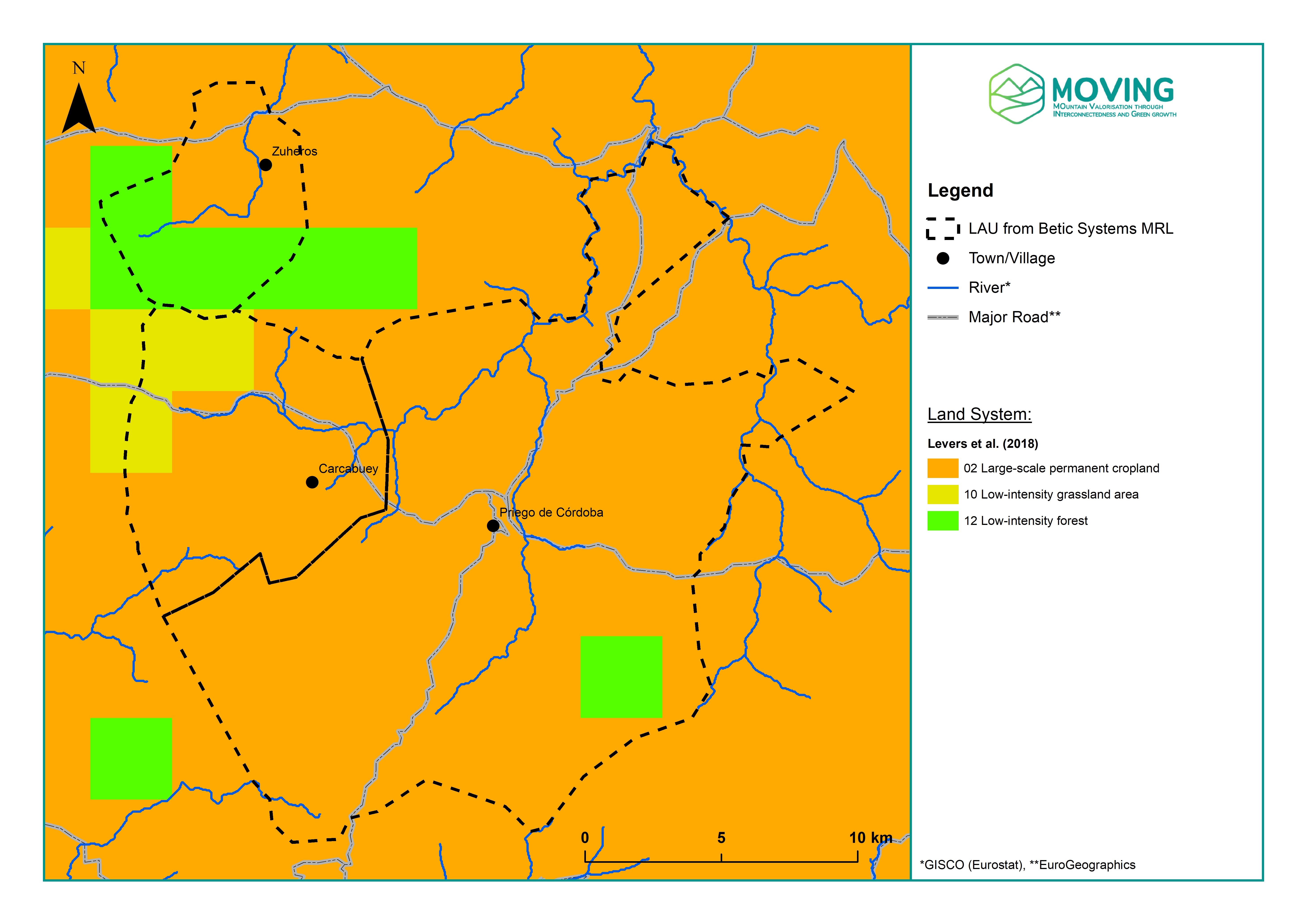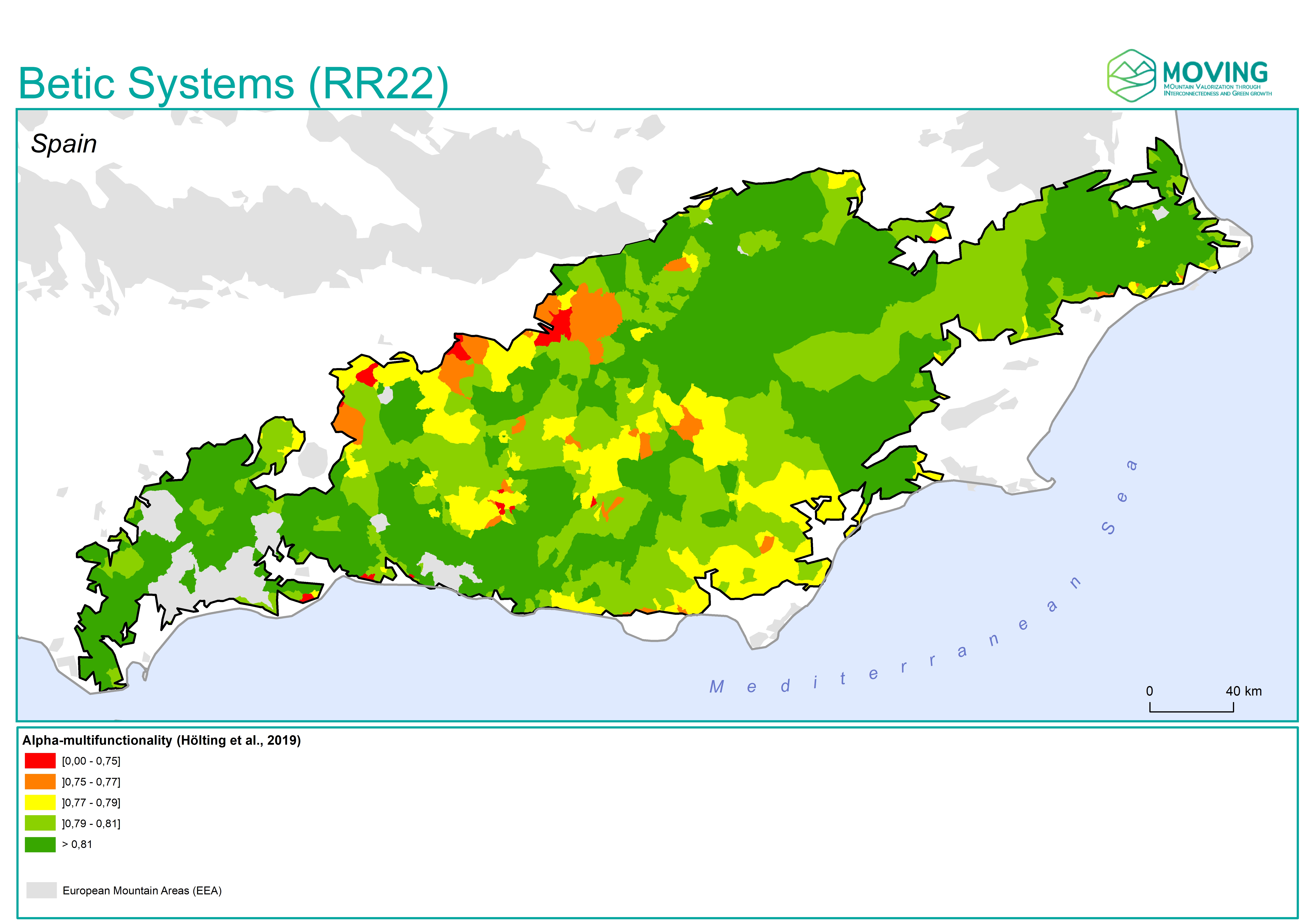 The MOVING project has developed accessible tools designed to assess susceptibility and vulnerability within the region, ready to be used by both experts and the general audience. This document synthesises crucial information for the Betic Systems Region, particularly focusing on the Participatory Vulnerability Matrix and the Spatial Vulnerability Map. Furthermore, it includes supplementary maps and figures detailing various aspects such as the delineation of Reference Landscape, distribution of land systems, areas affected by wildfires, susceptibility to floods across different return periods, severity of forest disturbances, rainfall erosivity, and more.