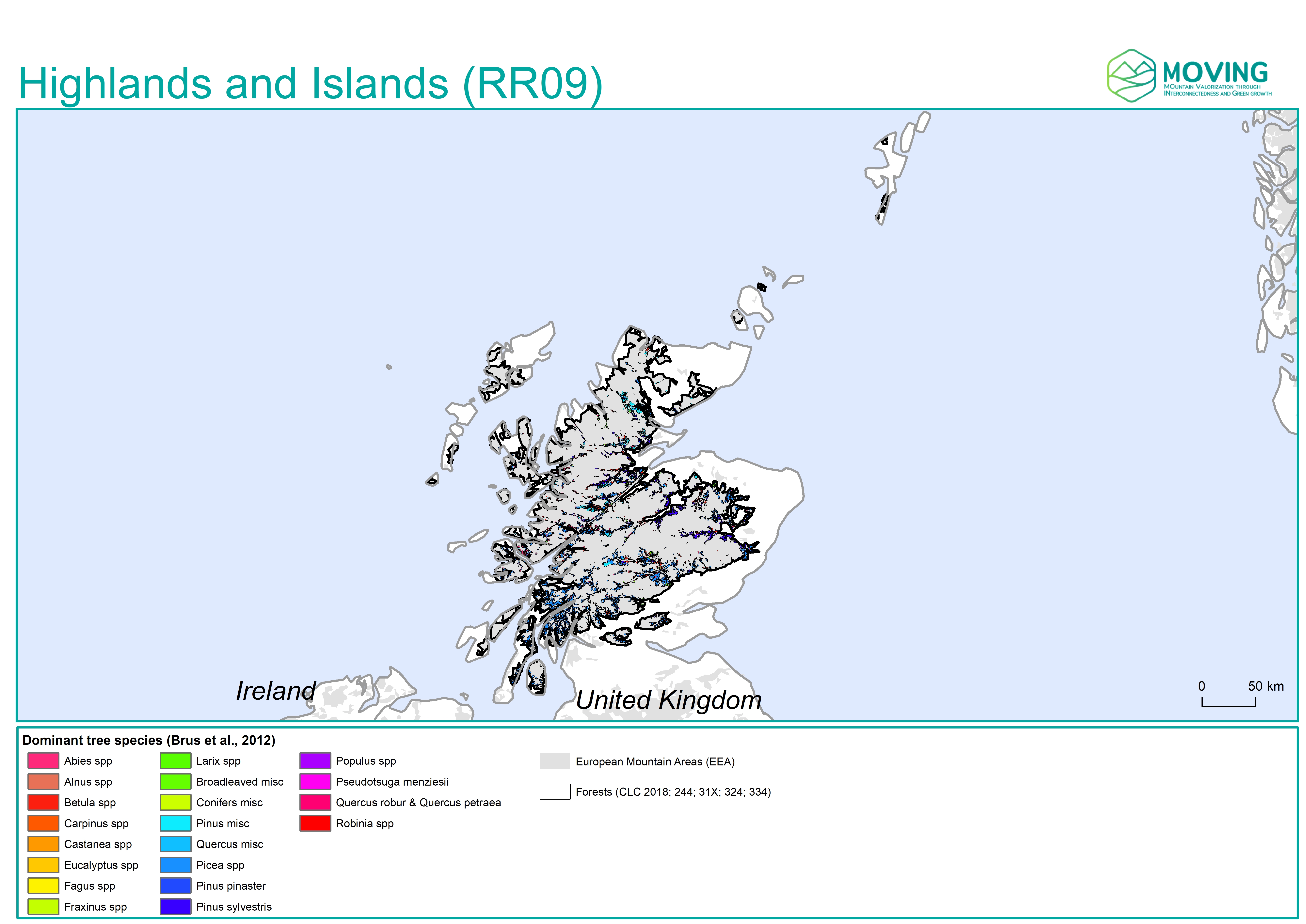 The MOVING project has developed accessible tools designed to assess susceptibility and vulnerability within the region, ready to be used by both experts and the general audience. This document synthesises crucial information for the Highlands and Islands Region, particularly focusing on the Participatory Vulnerability Matrix and the Spatial Vulnerability Map. Furthermore, it includes supplementary maps and figures detailing various aspects such as the delineation of Reference Landscape, distribution of land systems, areas affected by wildfires, susceptibility to floods across different return periods, severity of forest disturbances, rainfall erosivity, and more.