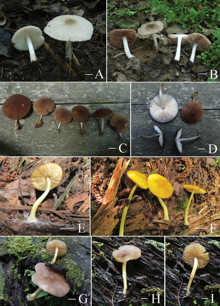 Figure 2 Basidiomata features A–BPluteus brunneodiscusC–DP. cystidiosusE–FP. chrysophlebiusG–IP. romellii. Photos by Zheng-xiang Qi (A–B, G–I). Photos by Di-zhe Guo (C–F). Scale bars: 1 cm.