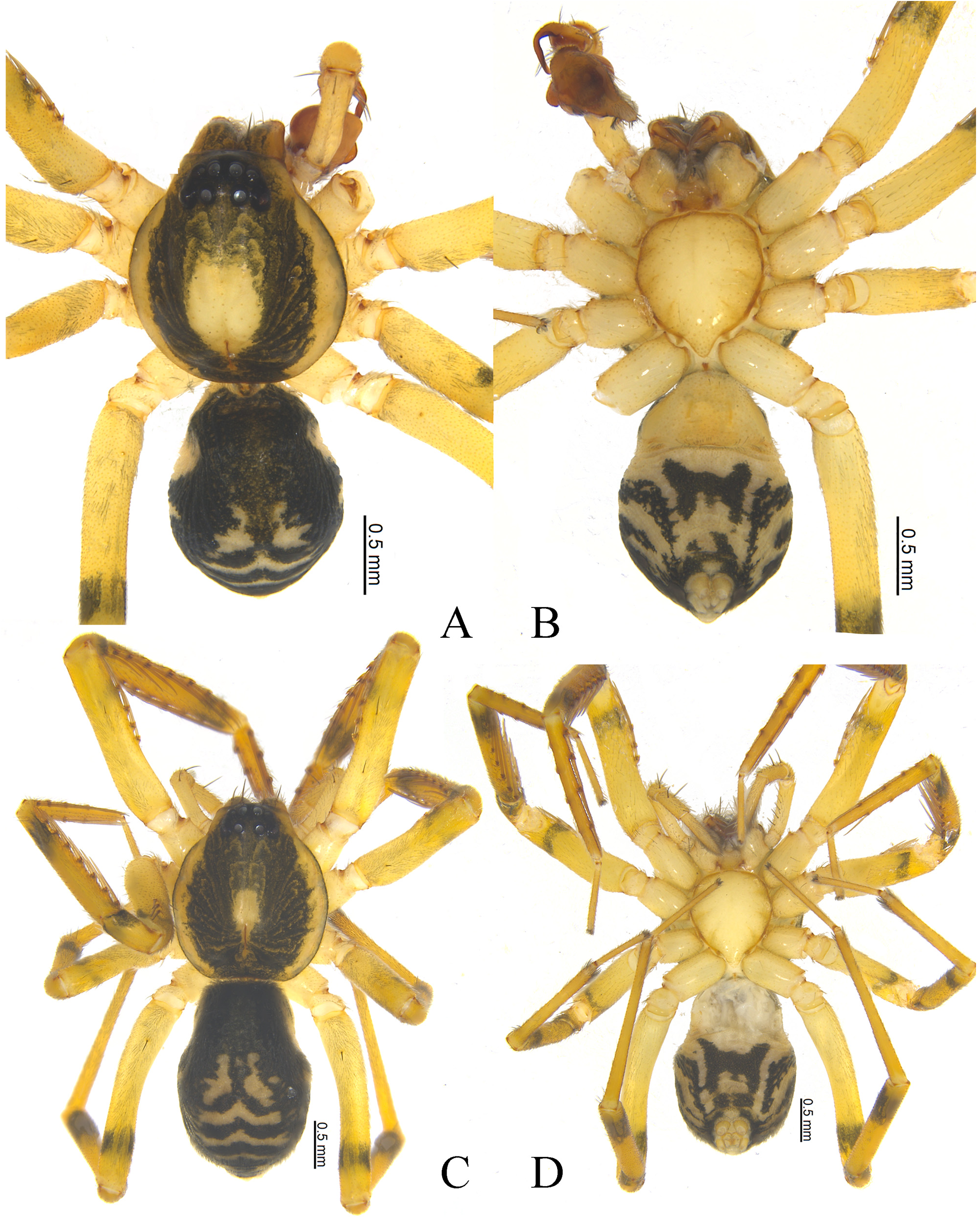 FIGURE 7. Habitus of Otacilia suining sp. nov.: A. Male holotype, dorsal view; B. Same, ventral view; C. Female paratype, dorsal view; D. Same, ventral view.