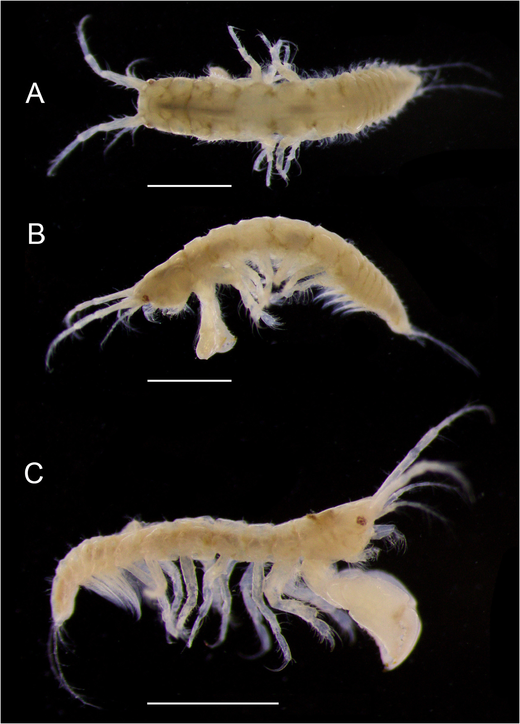 FIGURE 7. Calozodion sp. SG#1, SS-0134, Singapore: (A, B) non-ovigerous female, dorsal and lateral habitus, respectively; (C) adult male, lateral habitus. Scale bar = 1 mm.
