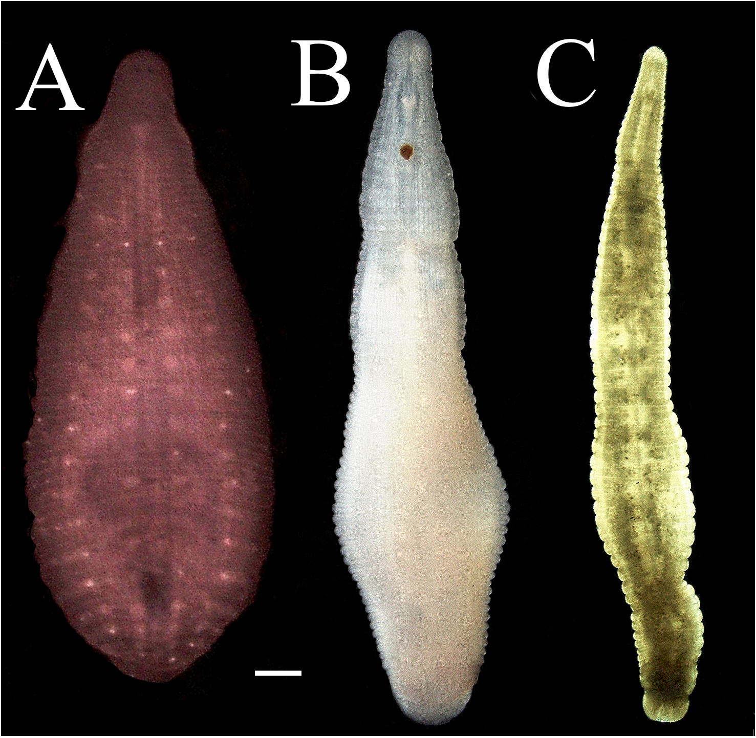 FIGURE 3. Three co-existing species of Helobdella indigenous to the Albemarle region of the Outer Banks, North Carolina. A, H. lineata, the subject of this paper, photographed in life, pigment and papillar pattern intact (HL-26); B, H. stagnalis (sensu lato) (Hst-1A); C, H. elongata (HE-2A). Scale bar: 1.0 mm.