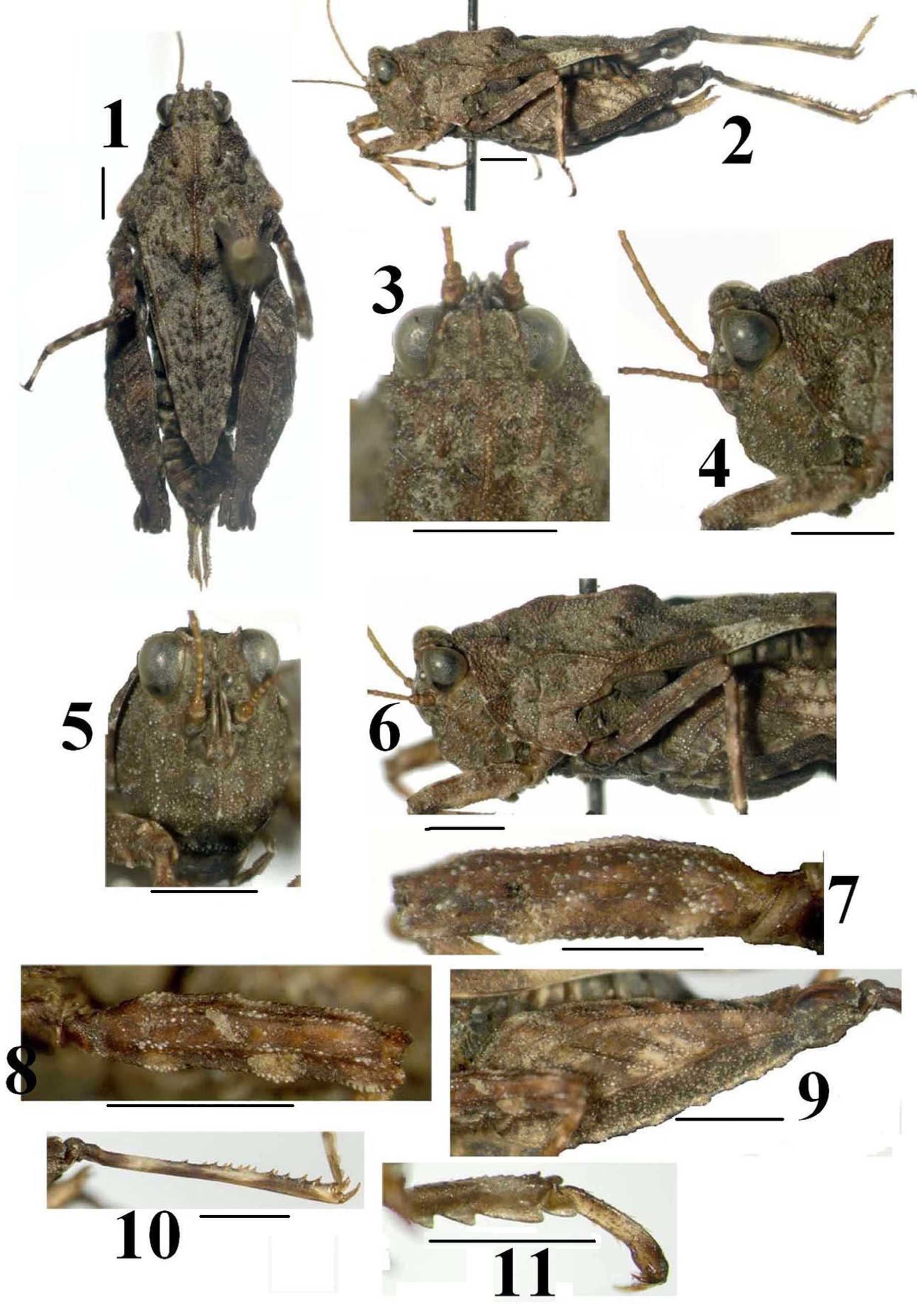 FIGURES 1–11. Macromotettix undulatifemura Deng sp. nov., female, holotype: 1—body in dorsal vieW; 2—body in lateral vieW; 3—head in dorsal vieW; 4—head in lateral vieW; 5—head in frontal vieW; 6—head and pronotum in lateral vieW; 7—left fore femur in lateral vieW; 8—left mid femur in lateral vieW; 9—left hind femur in lateral vieW; 10—left hind tibia in dorsal vieW; 11—left posterior tarsi in lateral vieW. (scale bar = 1 mm).