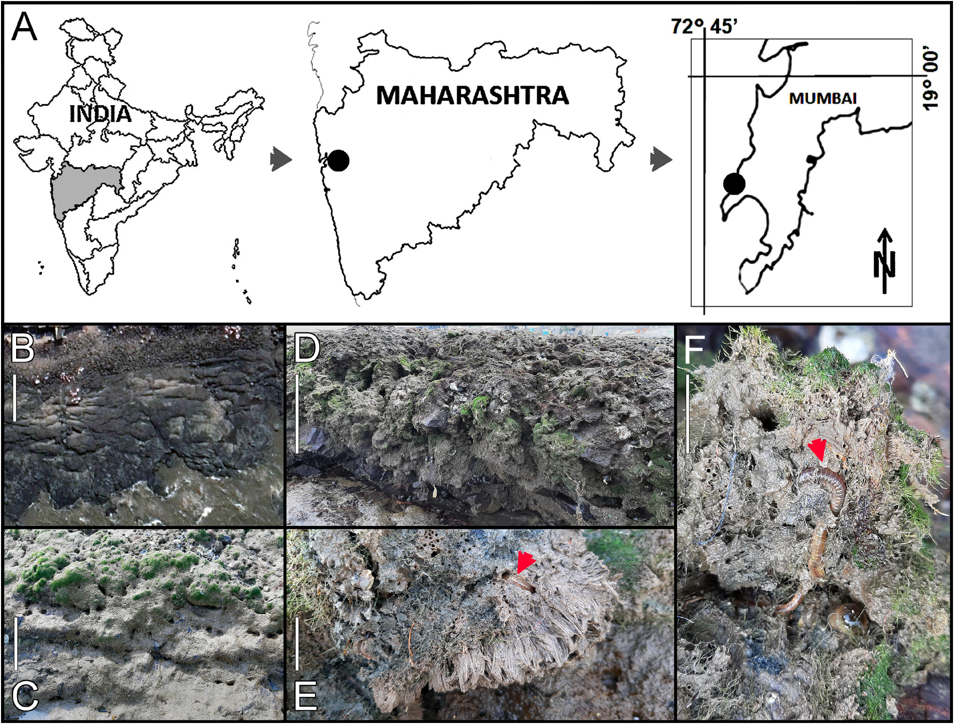 Fig. 1. Study area and surrounding intertidal habitats. A. Coastal region of Maharashtra (western India) and collecting localities. B. Aerial view of the rocky intertidal habitat of the study area. C. Intertidal area with rocks covered with seaweed. D. Close-up view of the intertidal area with rocks covered with seaweed and oyster shells. E. Scraped-out seabed (oyster shells, algae, and sediment), burrows of polychaetes and other small invertebrates can be seen. F. Close-up view of burrowing nereidid dwelling among the seabed. Red arrows point to burrowing worms. Scale bars: B = 20 m; C = 1 m; D = 50 cm; E–F = 3 cm.