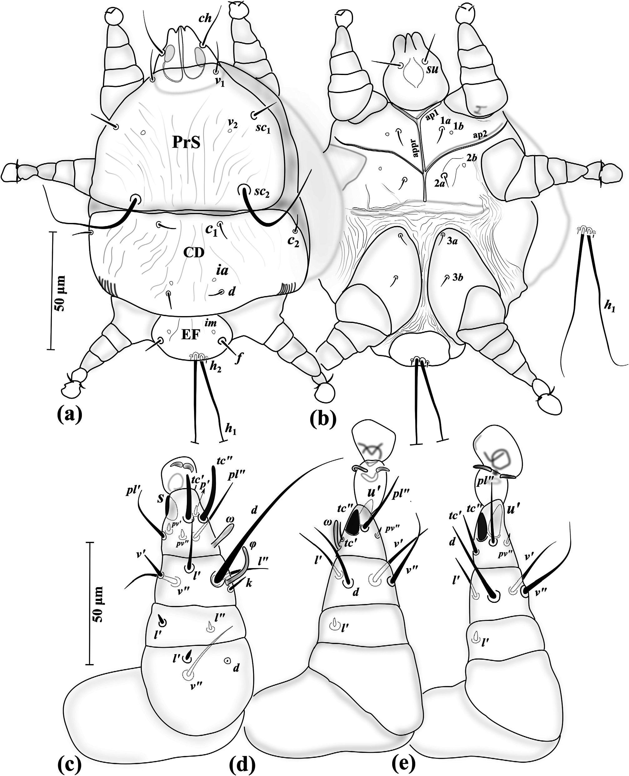 Figure 8. Eutarsopolipus pulcher n. sp. (larval female). (a) Body dorsum; (b) body venter; (c) right leg I; (d) right leg II; (e) right leg III. All legs in dorsal view.