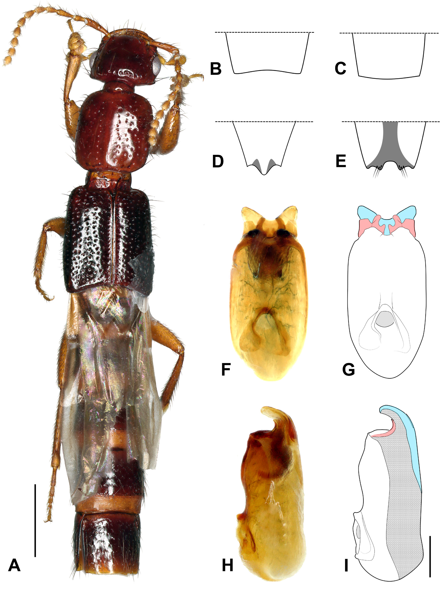 Fig. 6. Neolindus longithorax Guzman, Tokareva & Żyła sp. nov., holotype, ♂ (KUNHM-ENT). A. Habitus, dorsal view. B−E. Abdominal segments, posterior margin schemes. B. Tergite VII. C. Sternite VII. D. Tergite VIII. E. Sternite VIII. F−I. Aedeagus. F. Parameral view. G. Parameral view scheme. H. Lateral view. I. Lateral view scheme. Scale bars: A = 1 mm; B–I = 0.25 mm.