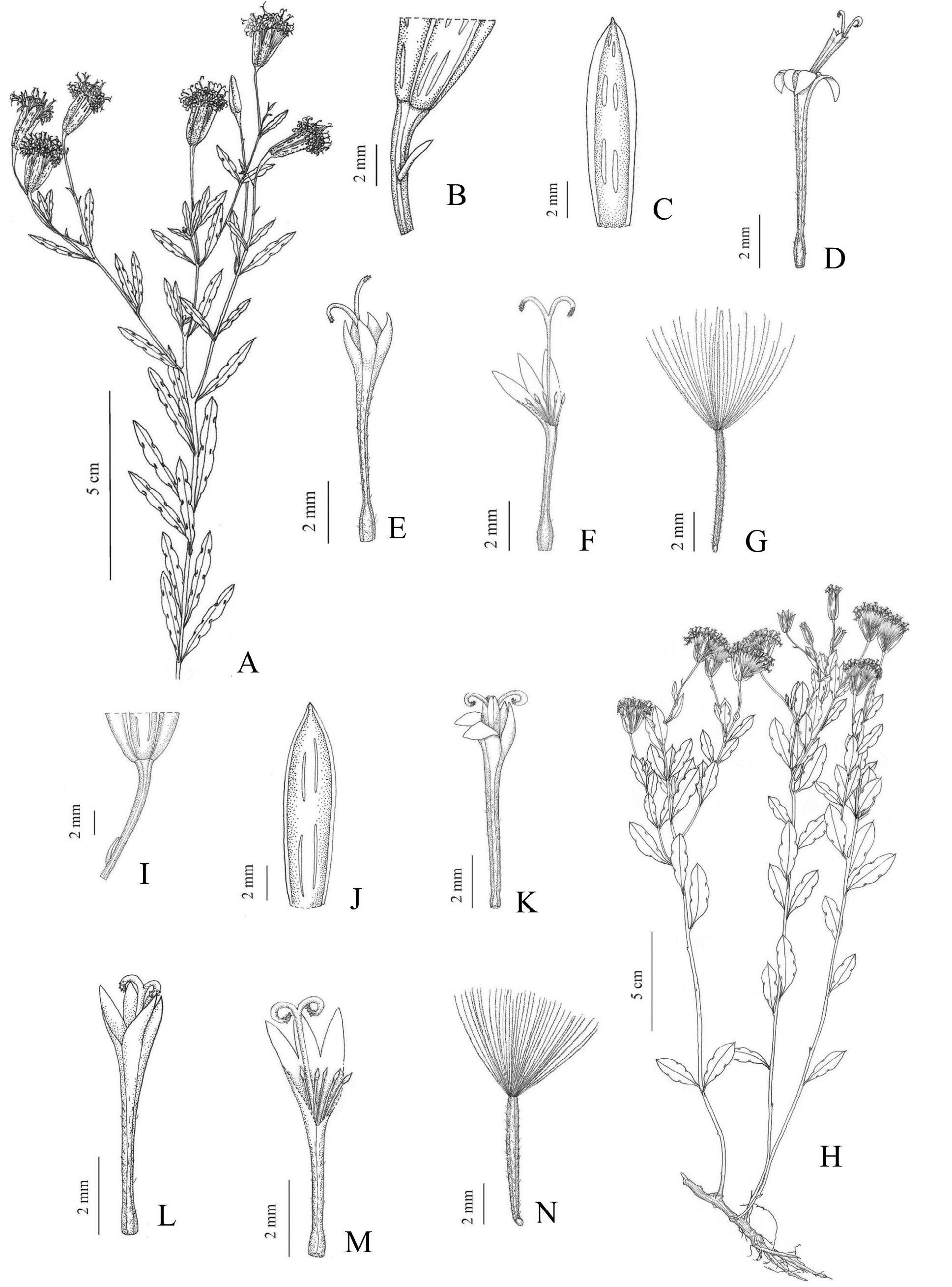 Figs. 2. A-N. A-G. Porophyllum curticeps Malme. A. Detalhe do ramo; B. Pedúnculo evidenciando posição da bráctea mais próxima ao capítulo; C. Bráctea involucral; D. Flor monoclina; E. Flor pistilada; F. Flor pistilada aberta mostrando os estaminódios; G. Cipsela e pápus (A, B, G. R. Setubal & J. Bassi 218, ICN. C, D. C.R. Carneiro 59, ICN. E, F. C.R. Carneiro 60, ICN). H-N. Porophyllum lanceolatum DC. H. Hábito; I. Pedúnculo evidenciando posição da bráctea mais próxima ao capítulo; J. Bráctea involucral; K. Flor monoclina; L. Flor pistilada; M. Flor pistilada aberta mostrando os estaminódios; N. Cipsela e pápus. (H, I, J, K, N. C.R. Carneiro 68, ICN. L, M. C.V. Ely, ICN 192033).