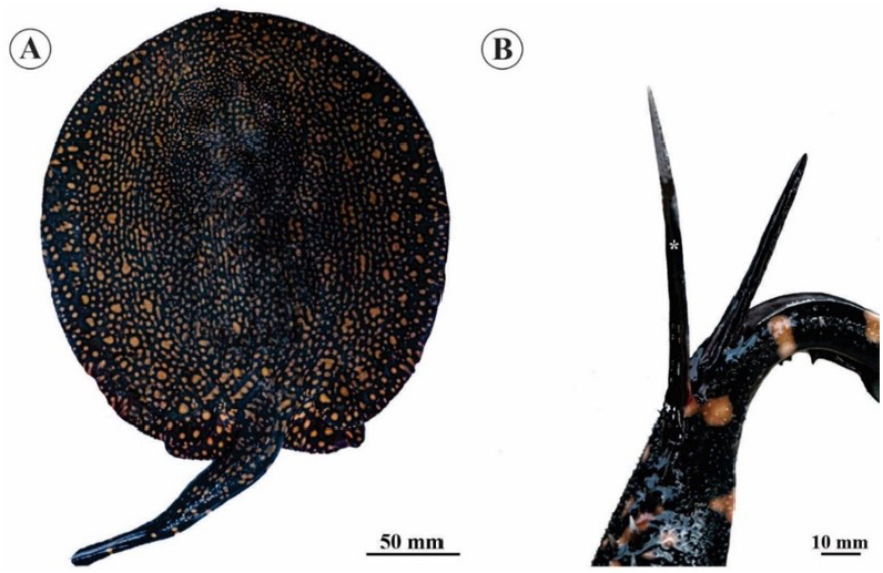 Figure 2. Adult female specimen of the stingray Potamotrygon rex. (A) Dorsal view of the stingray. (B) Tail of the stingray with two stingers attached to the middle portion of the tail, in the dorsal region, where the outermost stinger (*) is larger than the innermost one.