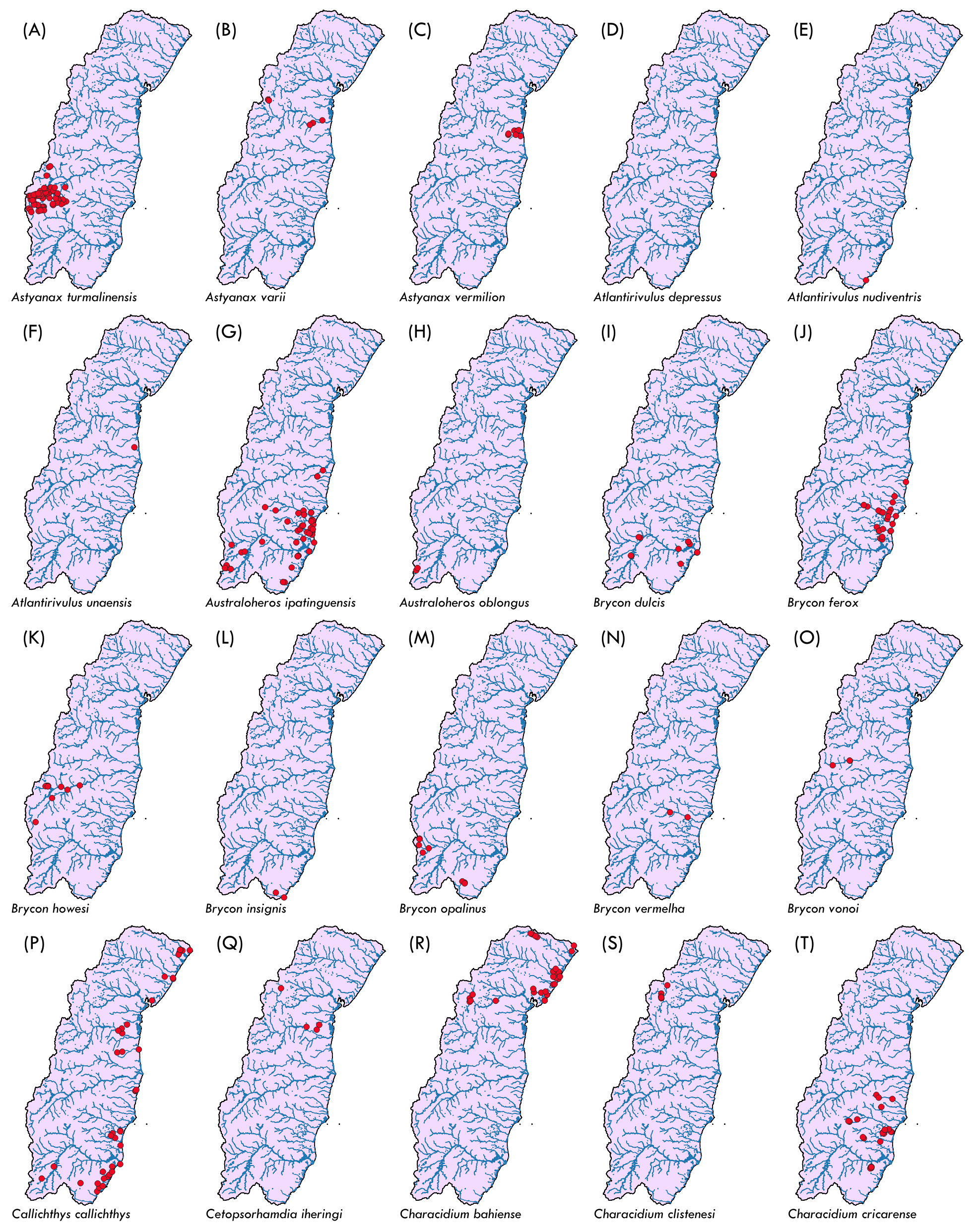 FIGURE 7. Distribution maps of native freshwater fishes occurring in the Northeastern Mata Atlântica ecoregion. (A) Astyanax turmalinensis; (B) Astyanax varii; (C) Astyanax vermilion; (D) Atlantirivulus depressus; (E) Atlantirivulus nudiventris; (F) Atlantirivulus unaensis; (G) Australoheros ipatinguensis; (H) Australoheros oblongus; (I) Brycon dulcis; (J) Brycon ferox; (K) Brycon howesi; (L) Brycon insignis; (M) Brycon opalinus; (N) Brycon vermelha; (O) Brycon vonoi; (P) Callichthys callichthys; (Q) Cetopsorhamdia iheringi; (R) Characidium bahiense; (S) Characidium clistenesi; (T) Characidium cricarense.