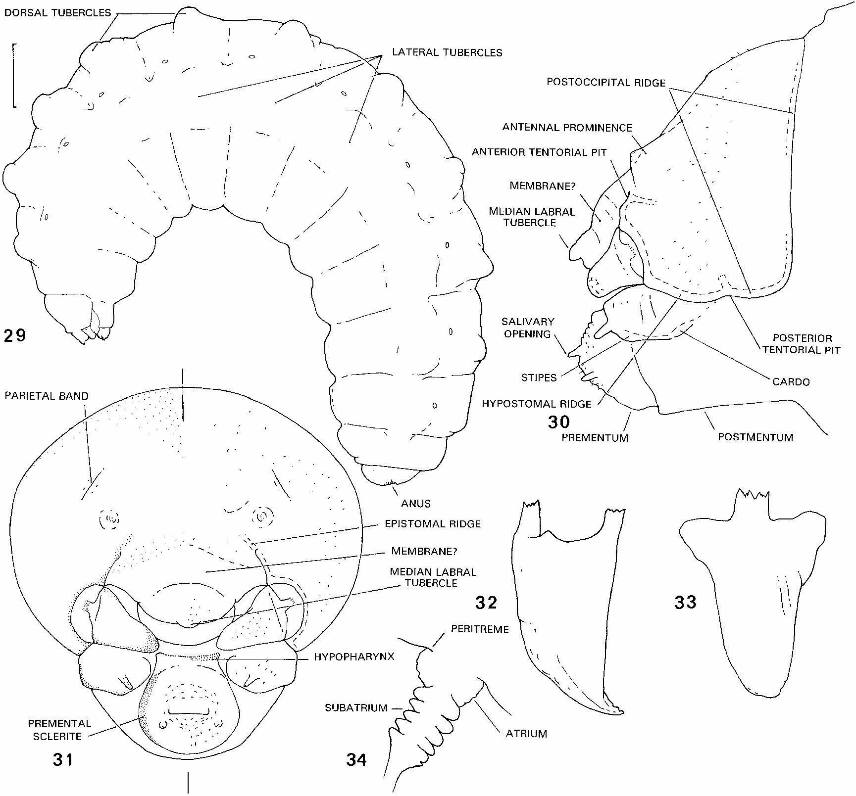 Figs. 29–34. Postdefecating larva of Melectoides bellus. 29. Entire larva, lateral view. 30. Head, lateral view. 31. Head, frontal view, pigmentation on left, sensilla and spicules on right. 32, 33. Right mandible, dorsal and inner views. 34. Spiracle, side view. Scale (= 1.0 mm) refers to fig. 29.