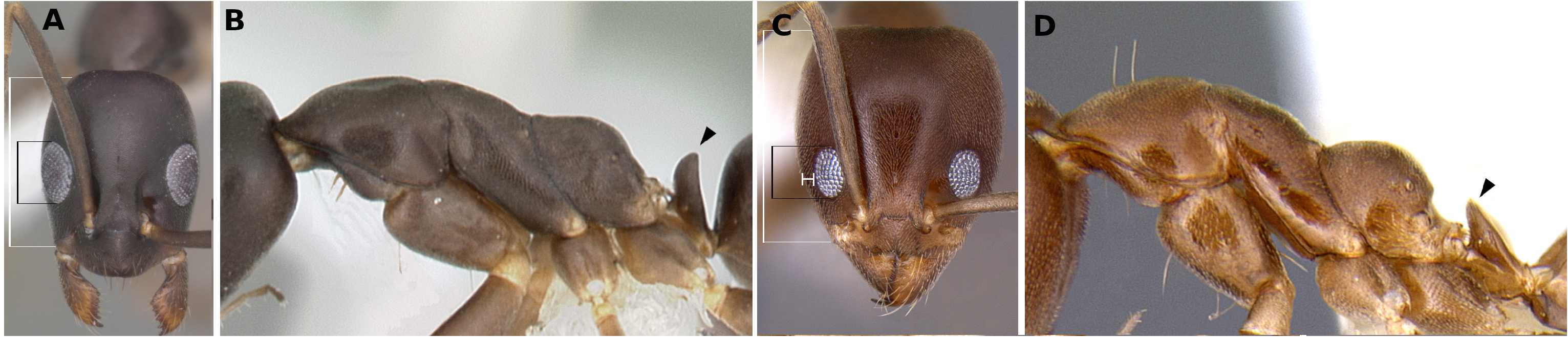 Fig. 10. Full-face view and profile view of A and B, Gracilidris pombero (CASENT0010797, www.antweb.org, image by April Nobile); and C and D, Linepithema neotropicum (CASENT0106968, www.antweb.org, image by Alexander Wild).