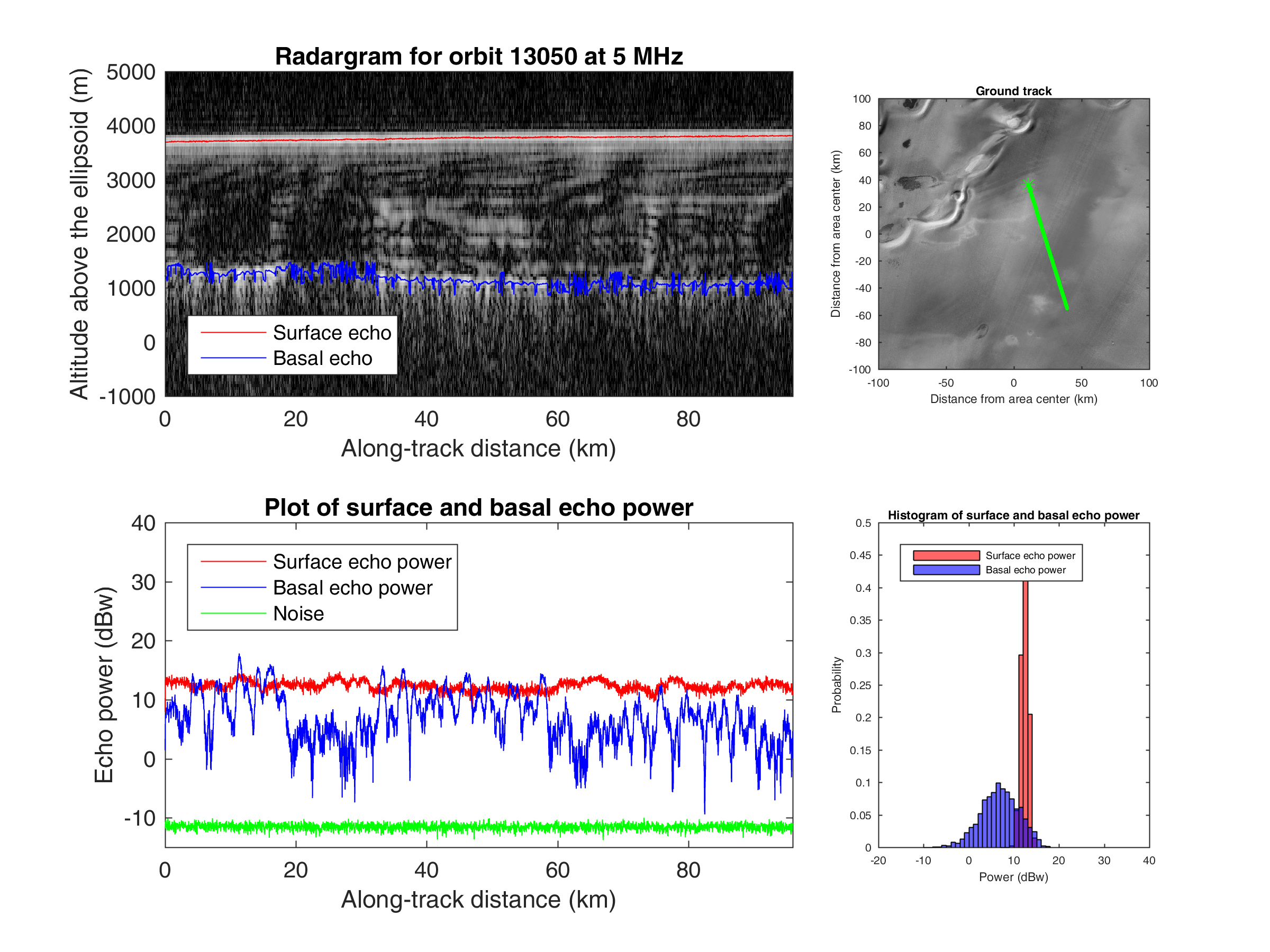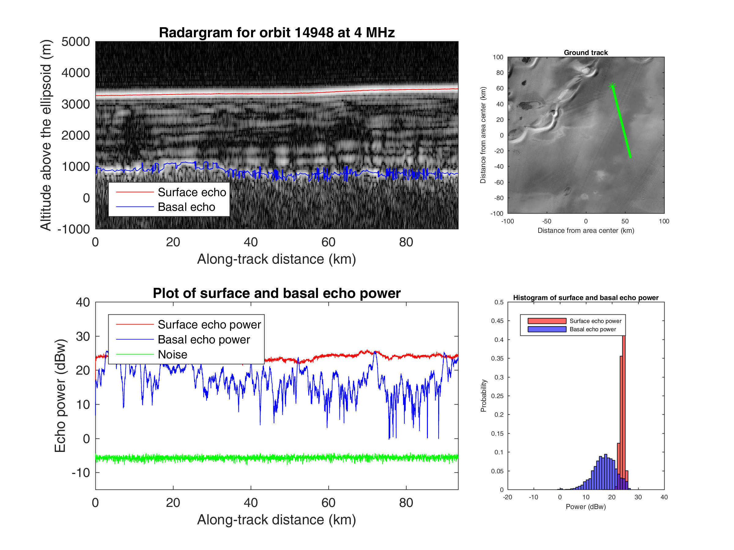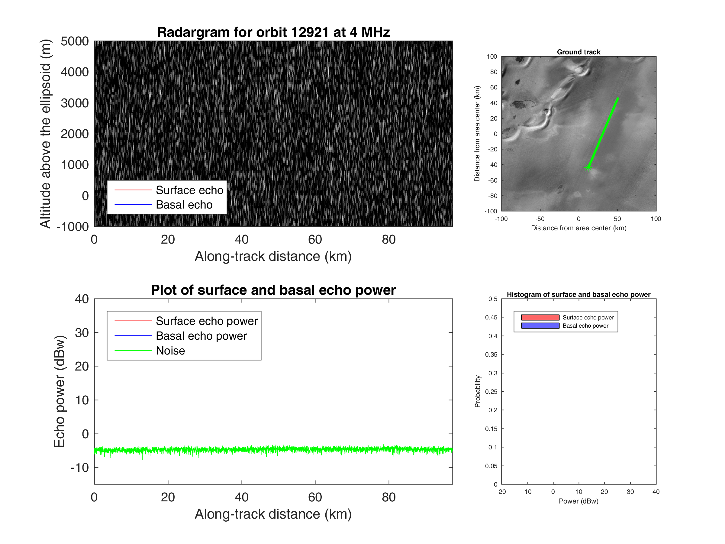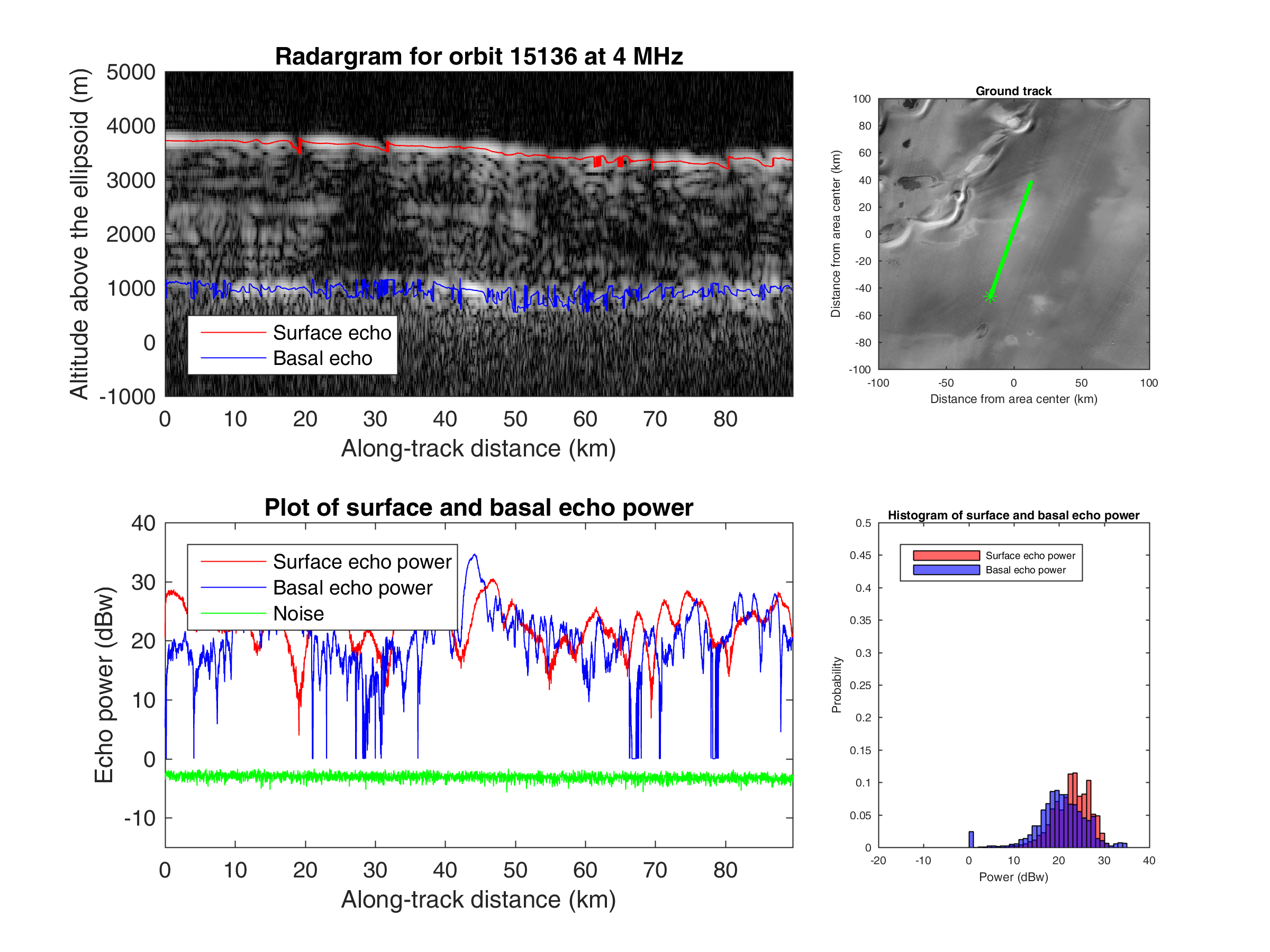 * orbit_XXXXX_frequency_Y_MHz.png, where XXXXX is the orbit number, and Y the frequency at which the radar was operating, in MHz. The file is a visualization of the corresponding radargram, of the spacecraft ground track during the observation, and of surface and subsurface echo power.