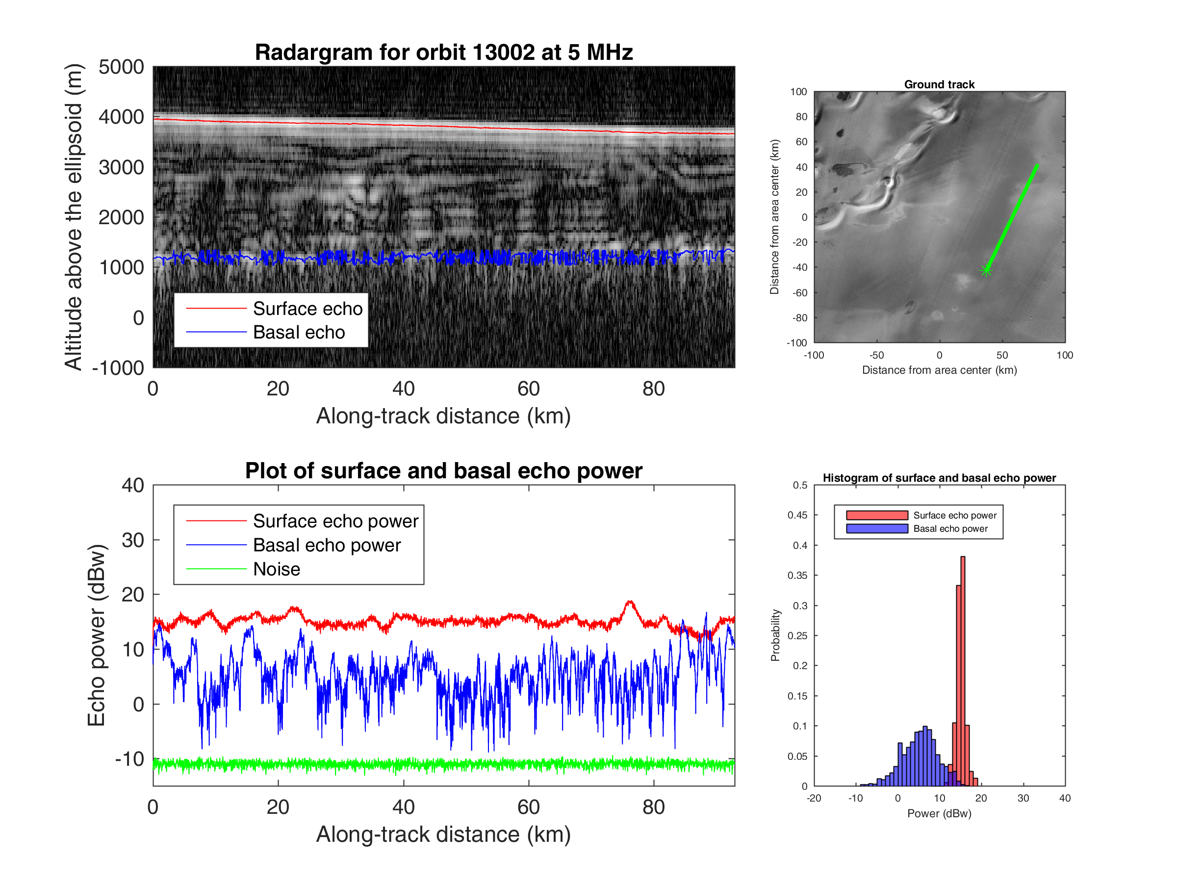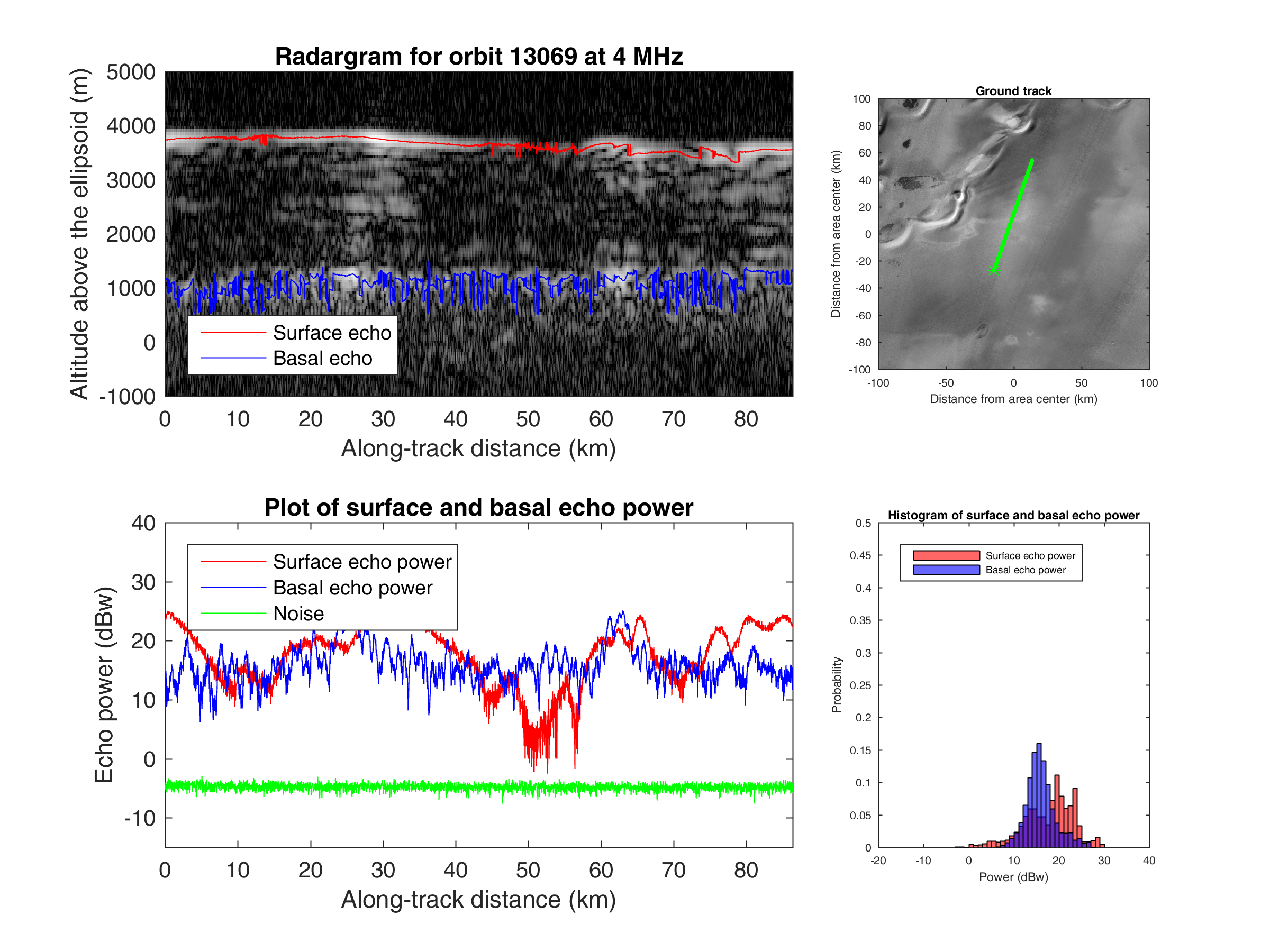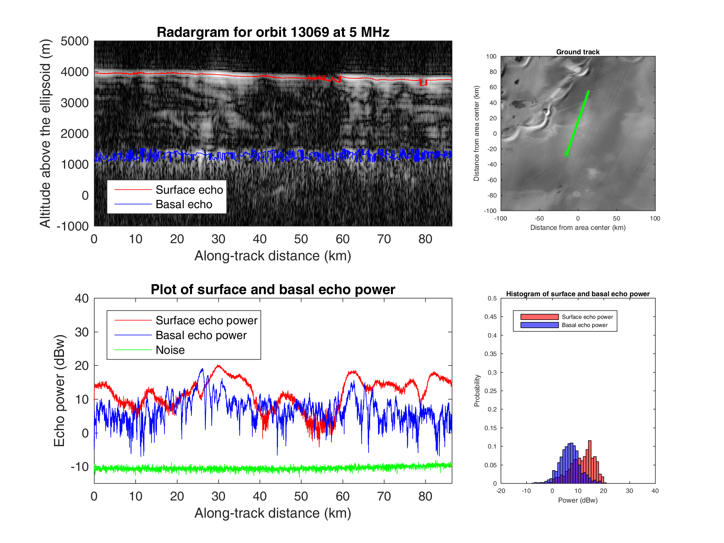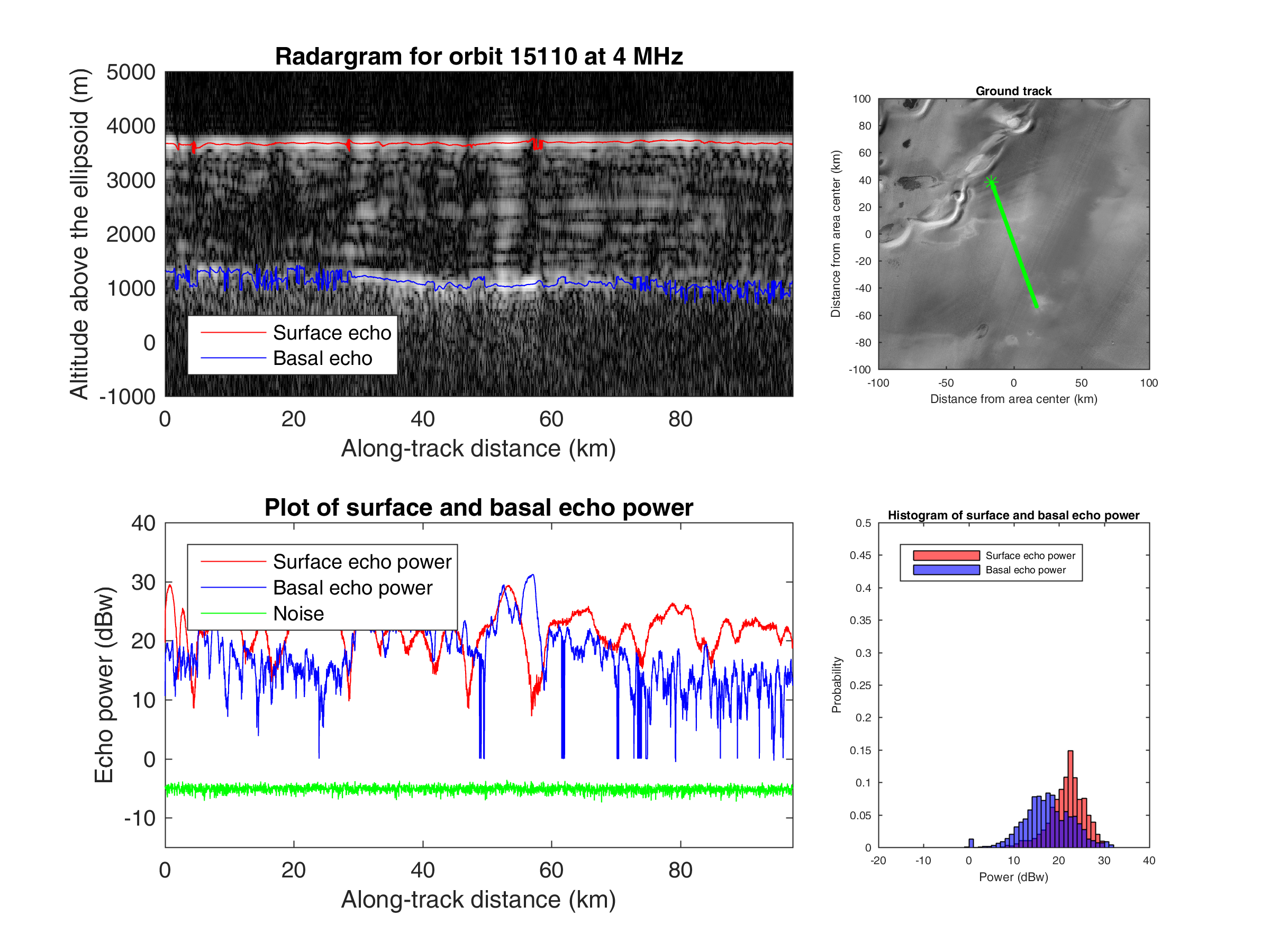 * orbit_XXXXX_frequency_Y_MHz.png, where XXXXX is the orbit number, and Y the frequency at which the radar was operating, in MHz. The file is a visualization of the corresponding radargram, of the spacecraft ground track during the observation, and of surface and subsurface echo power.