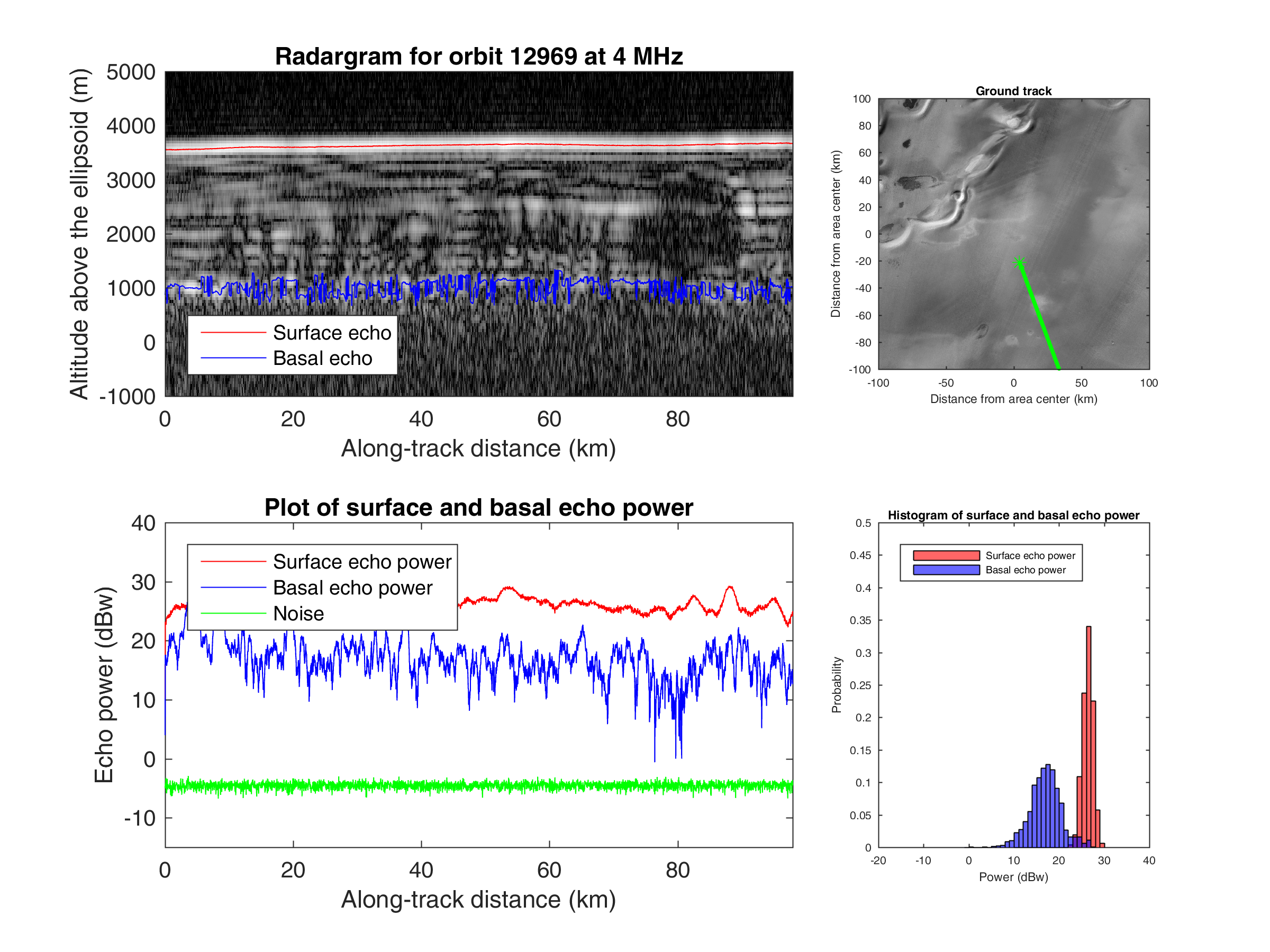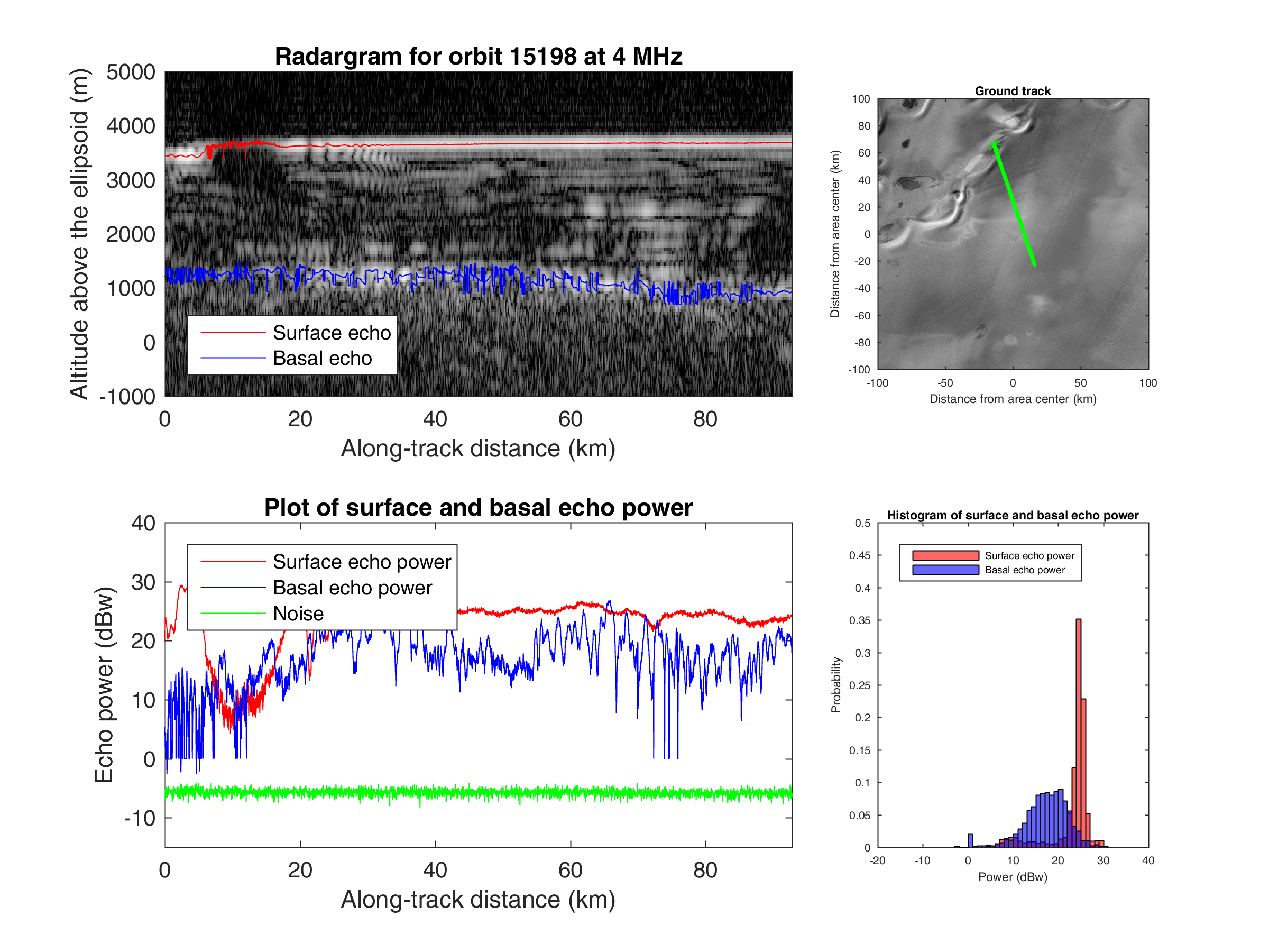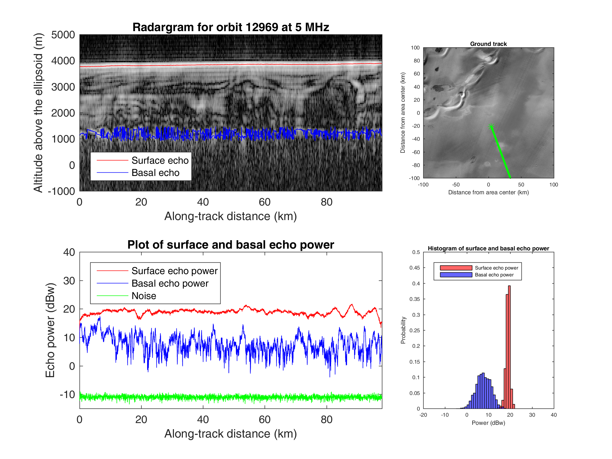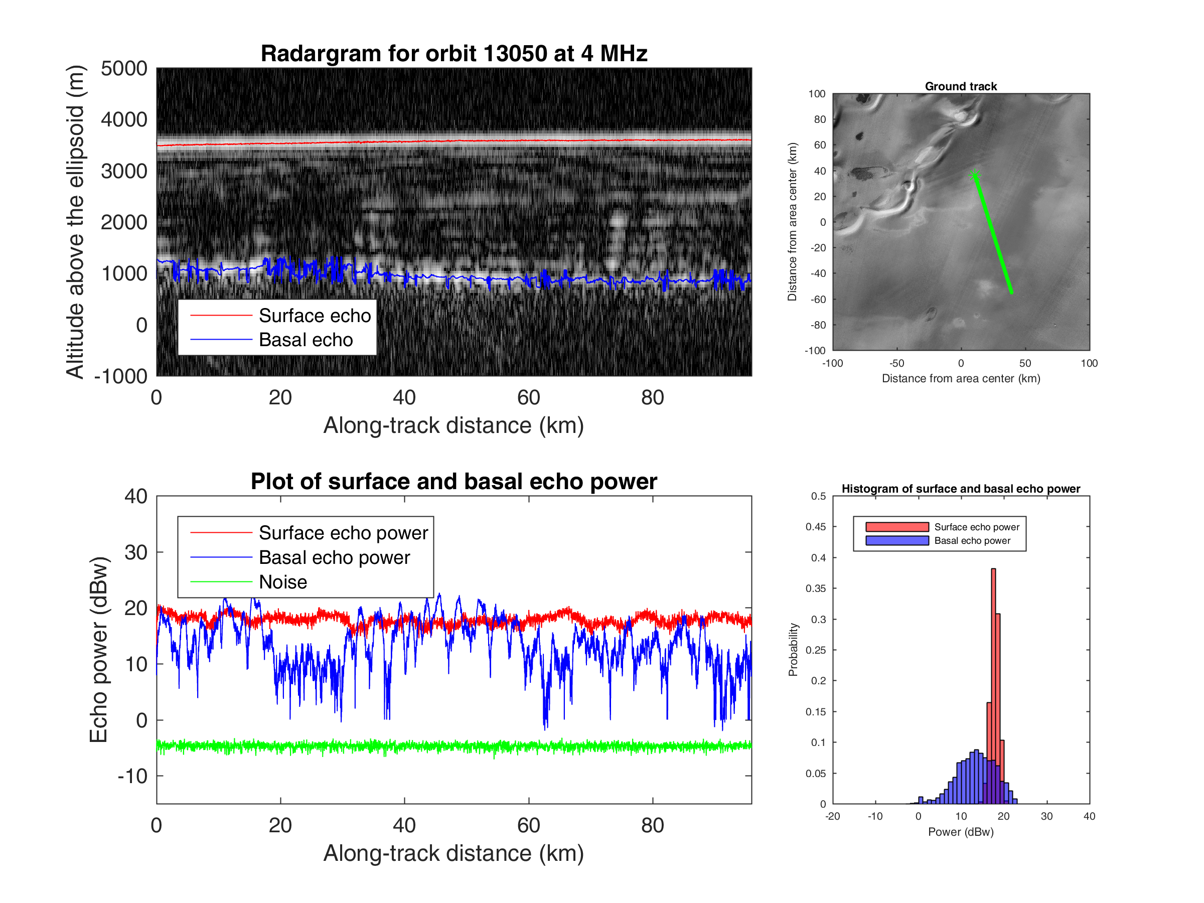 * orbit_XXXXX_frequency_Y_MHz.png, where XXXXX is the orbit number, and Y the frequency at which the radar was operating, in MHz. The file is a visualization of the corresponding radargram, of the spacecraft ground track during the observation, and of surface and subsurface echo power.