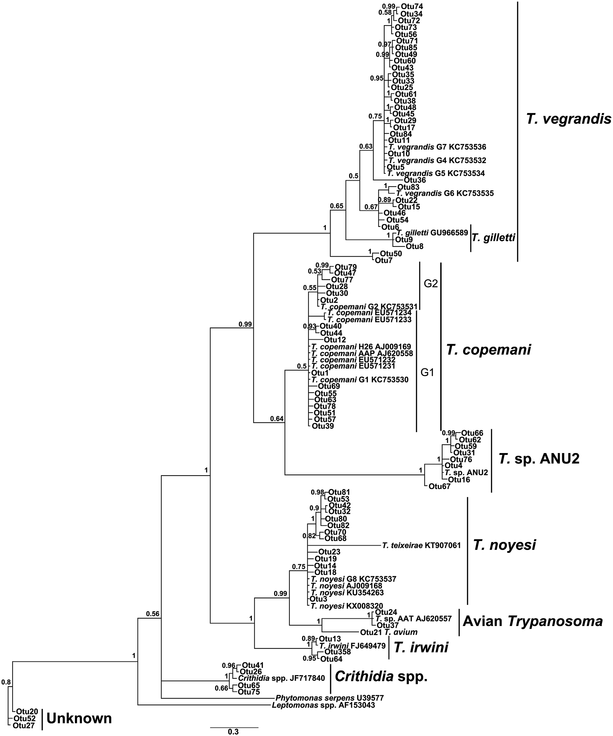 Fig. 1. Phylogenetic relationships between Trypanosoma spp. ZOTUs assigned to nine species groups compared to 24 representative reference strains downloaded from Genbank. Phytomonas serpens and Leptomonas sp. were used as outgroups. Bayesian analysis was used to produce tree topology and posterior probability is shown at nodes. Scale bar represents substitution per site.
