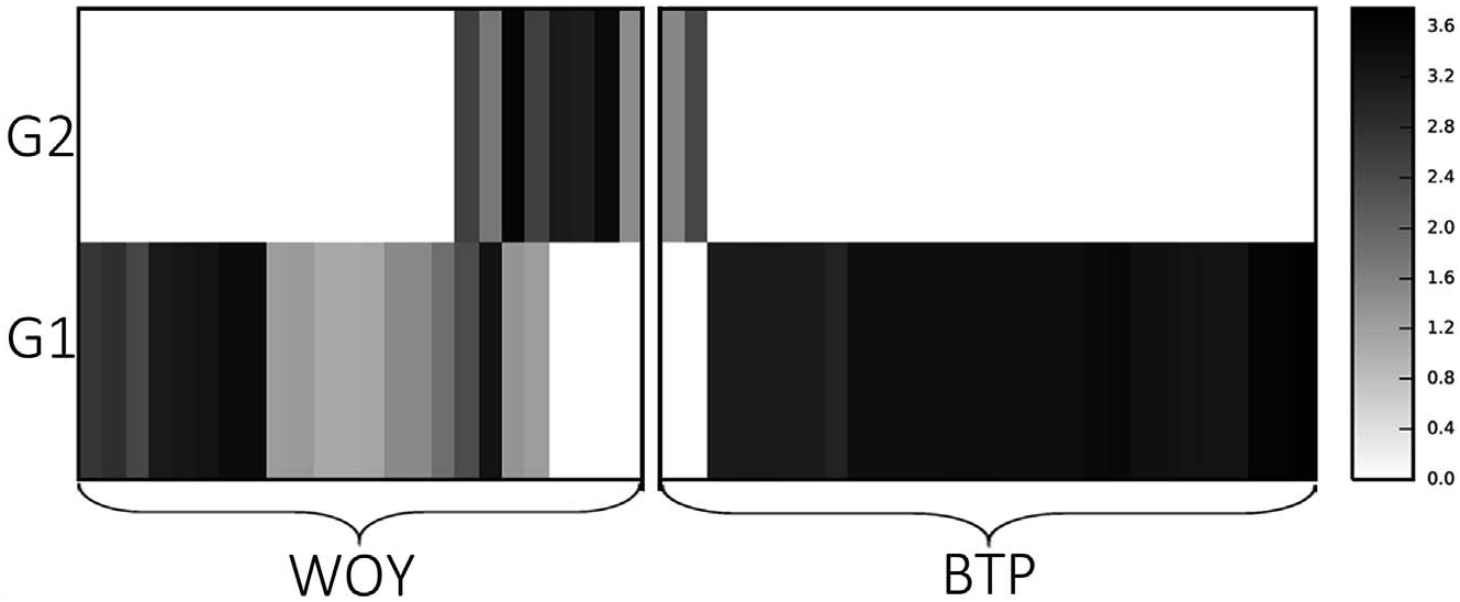 Fig. 2. Abundance and diversity map of Trypanosoma copemani genotype 1 (G1) and genotype 2 (G2) positive samples. ZOTUs were sorted into G1 or G2 based on phylogenetic inference shown in rows, while columns are individual marsupial blood samples from infected individuals. The map represents samples separated by host species, which were WOY = woylie, or BTP = brushtail possum. Grayscale indicates number of sequences obtained from that sample as shown in the scale of intensity on the right (log transformed abundance).