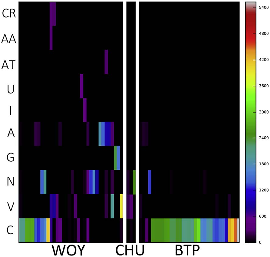 Fig. 4. Abundance and diversity map of Trypanosoma spp. ZOTUs in different marsupial blood samples assigned to species groups shown in rows, while columns are individual blood samples. Samples are separated by host species including; WOY = woylie (34), CHU = chuditch (3), and BTP = brushtail possum (33). The colour scale indicates increasing number of sequences obtained from that sample, in that species, as shown in the intensity bar on the right. Species include; C = Trypanosoma copemani, V = T. vegrandis, N = T. noyesi, G = T. gilletti, A = T. sp. ANU2, I = T. irwini, AT = T. sp. AAT, U = unknown, AA = T. avium, and CR = Crithidia spp. (For interpretation of the references to colour in this figure legend, the reader is referred to the Web version of this article.)