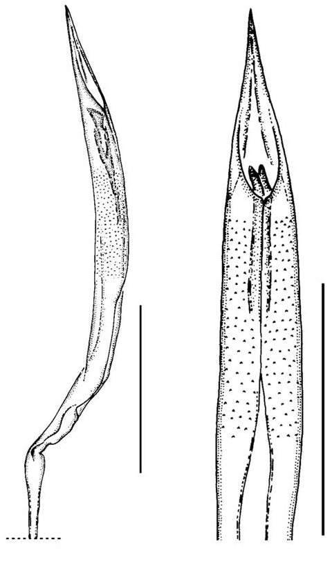 Figs. 5, 6. Aedeagus of Dienerella costulata. 5. lateral aspect. 6. dorsal aspect. Scales=0.1 mm.