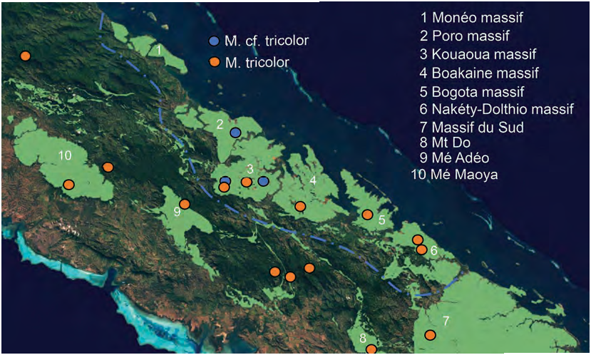 FIGURE 8. Distribution of ultramafic surfaces in the central-east region of Grande Terre showing location of populations in the Group 3 M. cf. tricolor lineage and regionally sympatric Group 4 M. tricolor lineage.
