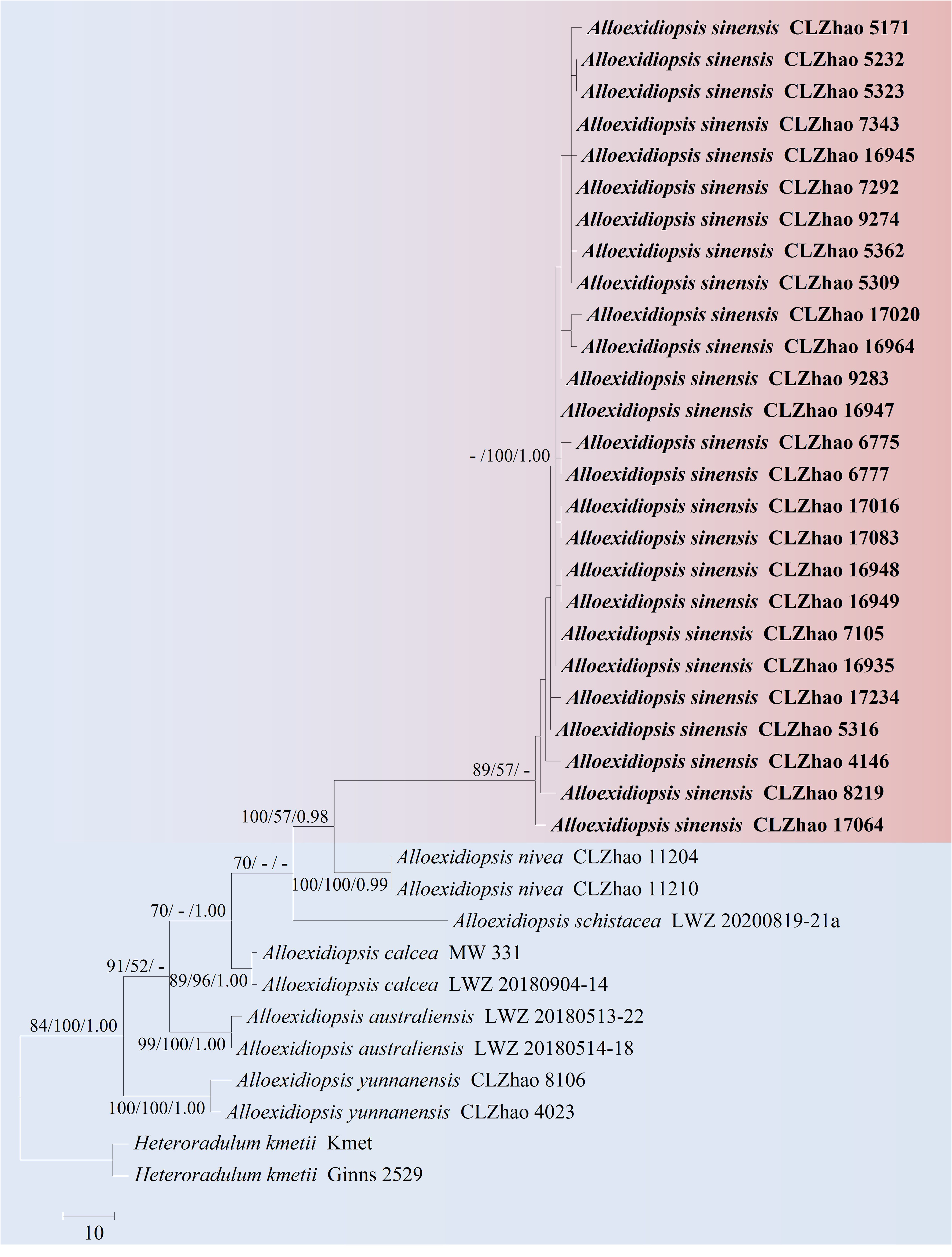 FIGURE 2. Maximum Parsimony strict consensus tree illustrating the phylogeny of the new species Alloexidiopsis sinensis and related species in the genus Alloexidiopsis based on ITS sequences. Branches are labeled with Maximum Likelihood bootstrap values equal to or above 70%, Maximum Parsimony bootstrap values equal to or above 50% and Bayesian posterior probabilities equal to or above 0.95.