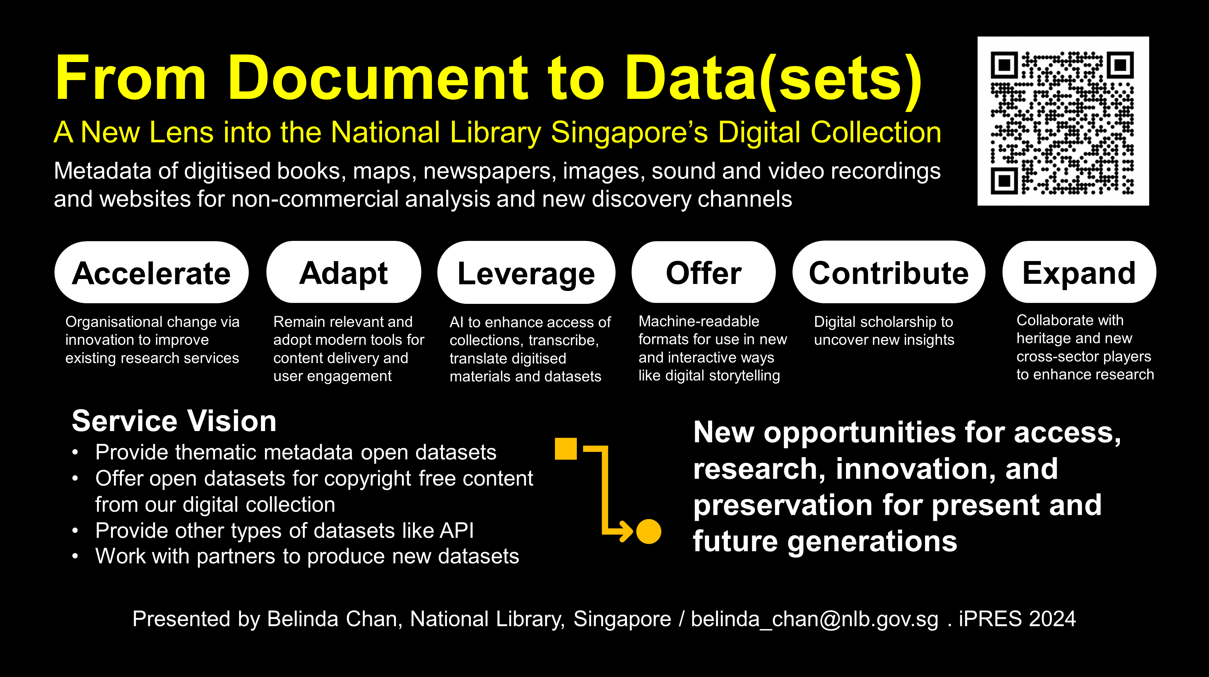 From document to data(sets), the National Library Singapore has demonstrated forward thinking in our collections strategy to shift from physical to digital, and from digital to data(sets), leading to new opportunities for access, research, innovation, and preservation for our present and future generations.