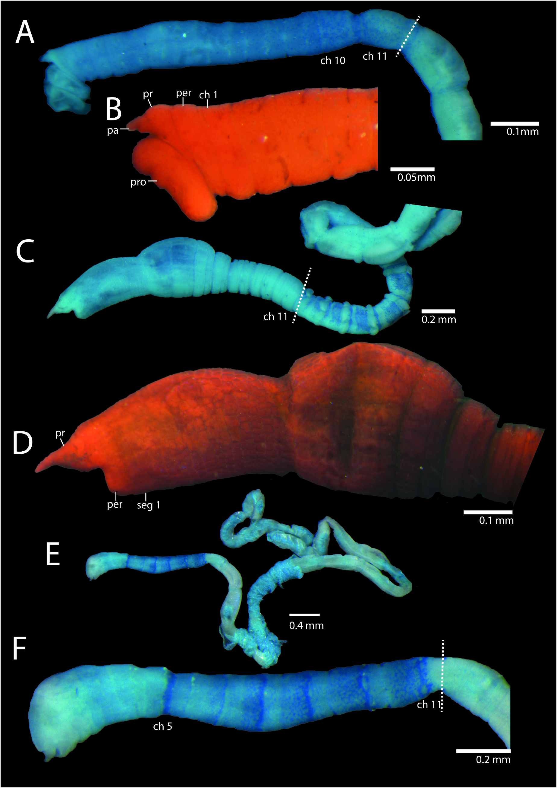 FIGURE 4. MGSP of French capitellids. Mediomastus biscayensis sp. nov.: A, anterior end, lateral view; B, Detail of anterior end in lateral view stained with Shirlastain A. Notomastus hutchingsae sp. nov.: C, Anterior end, lateral view; D, Detail of thoracic region in lateral view stained with Shirlastain A. Peresiella ellae sp. nov.: E, holotype in lateral view showing fragmented mucous tube; F, detail of anterior end, lateral view. Abbreviations: ch, chaetiger; pa, palpode; per, peristomium; pr, prostomium; pro, proboscis; seg, segment.