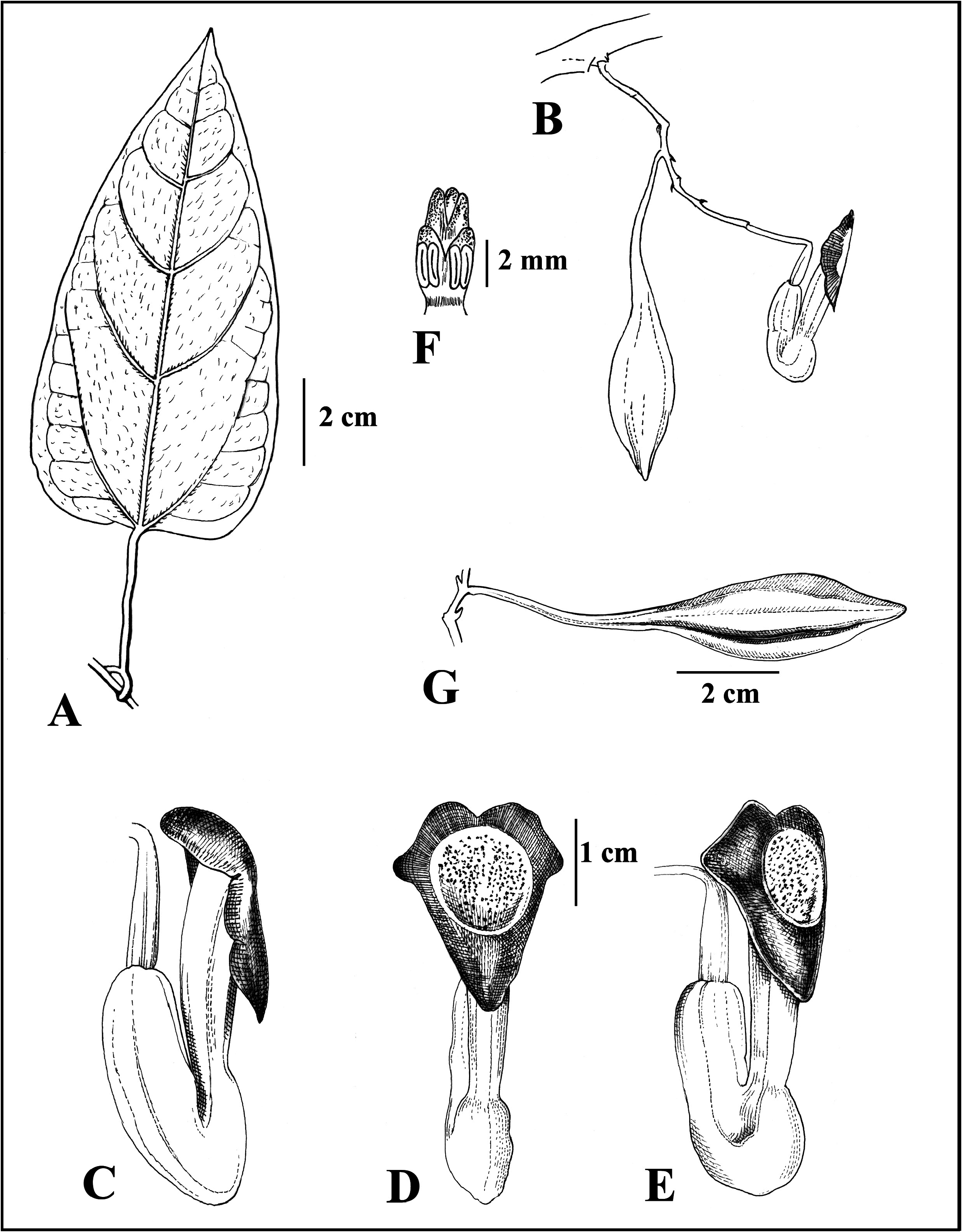 FIGURE 1. Aristolochia annamensis. A. Abaxial leaf surface. B. Solitary cyme on old woody stem. C. Lateral view of open flower. D. Front view of open flower. E. Oblique view of open flower. F. Close up of gynostemium. G. Capsule. Drawn by Bernd Schulz from the type specimen.