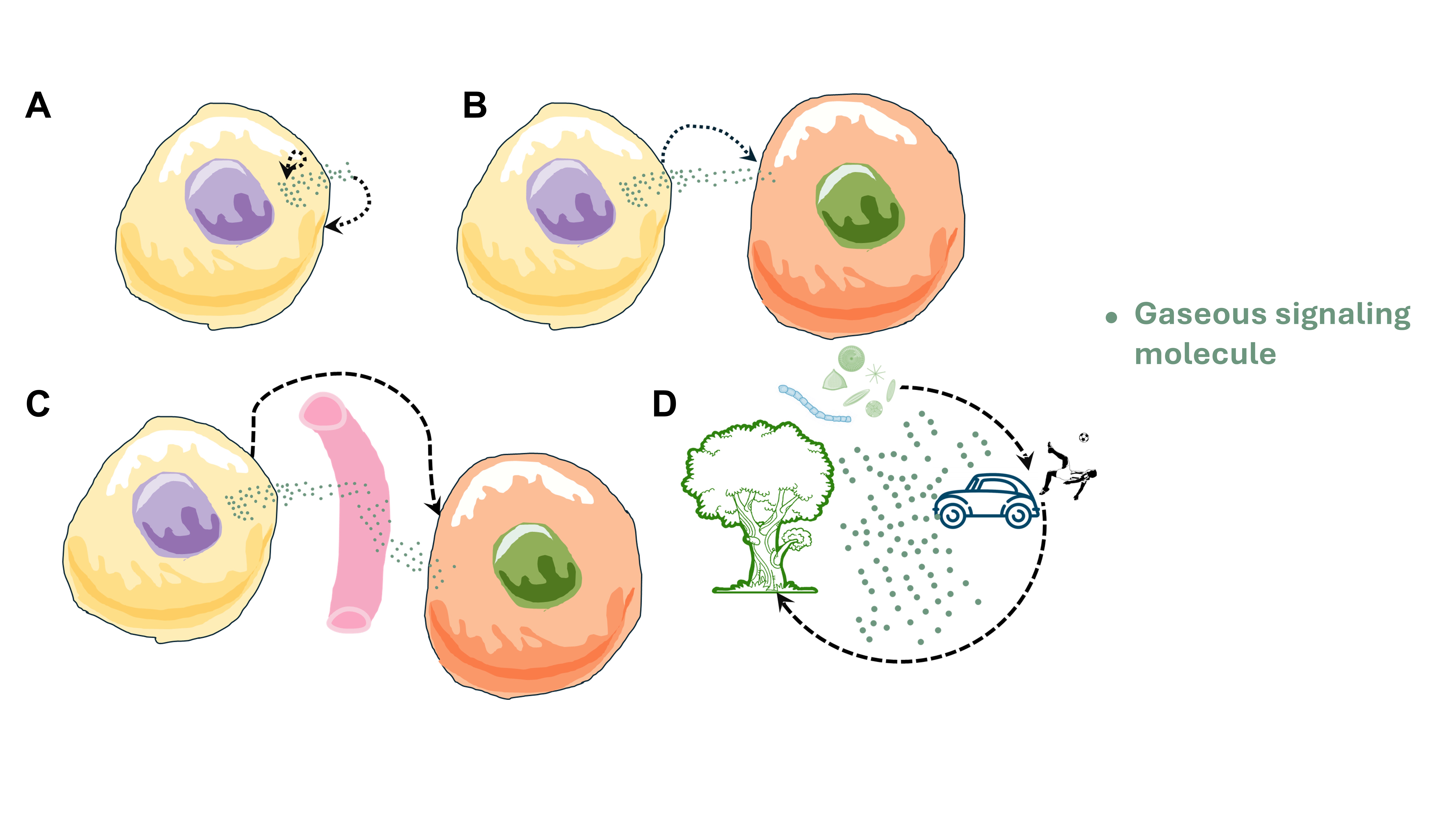 (A) Autocrine-based gasocrine signaling. (B) Paracrine-based gasocrine signaling. (C) Endocrine-based gasocrine signaling. (D) Inter-organismal and non-biotic factor-based gasocrine signaling.