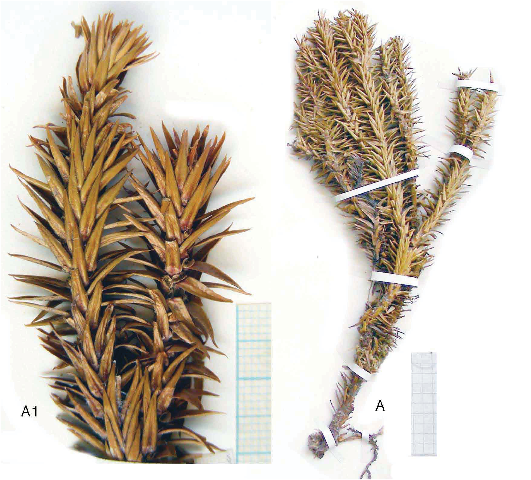 FIGURE 9. Phlegmariurus acutus, A, growth habit, A1, close-up of terminal sporangiate division (Tate 374, NY).