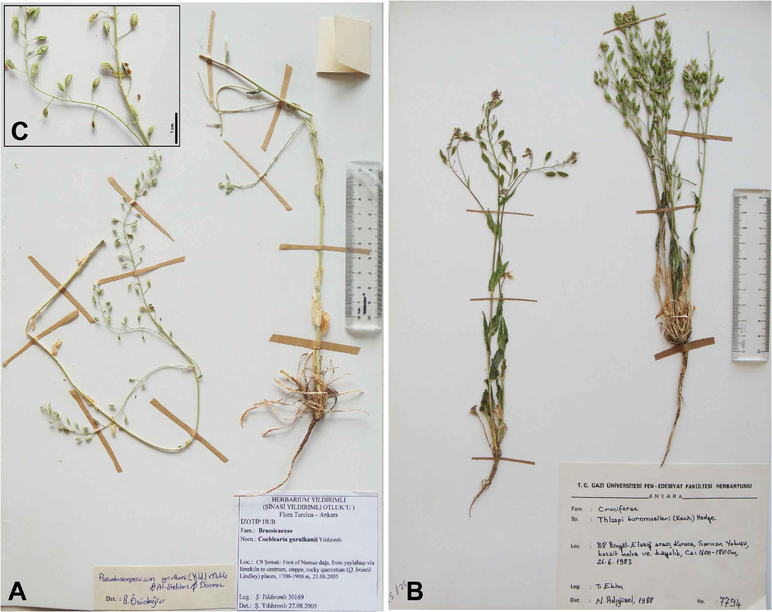 FIGURE 1. Representative specimens of Noccaea venusta. A. Isotype of Pseudosempervivum gurulkanii with undamaged main stem (Yıldırımlı 30169, HUB!); B. "Many-stemmed form" of Noccaea venusta (Ekim 7794, GAZI!); C. Fruits of Noccaea venusta (Pseudosempervivum gurulkanii, isotype).