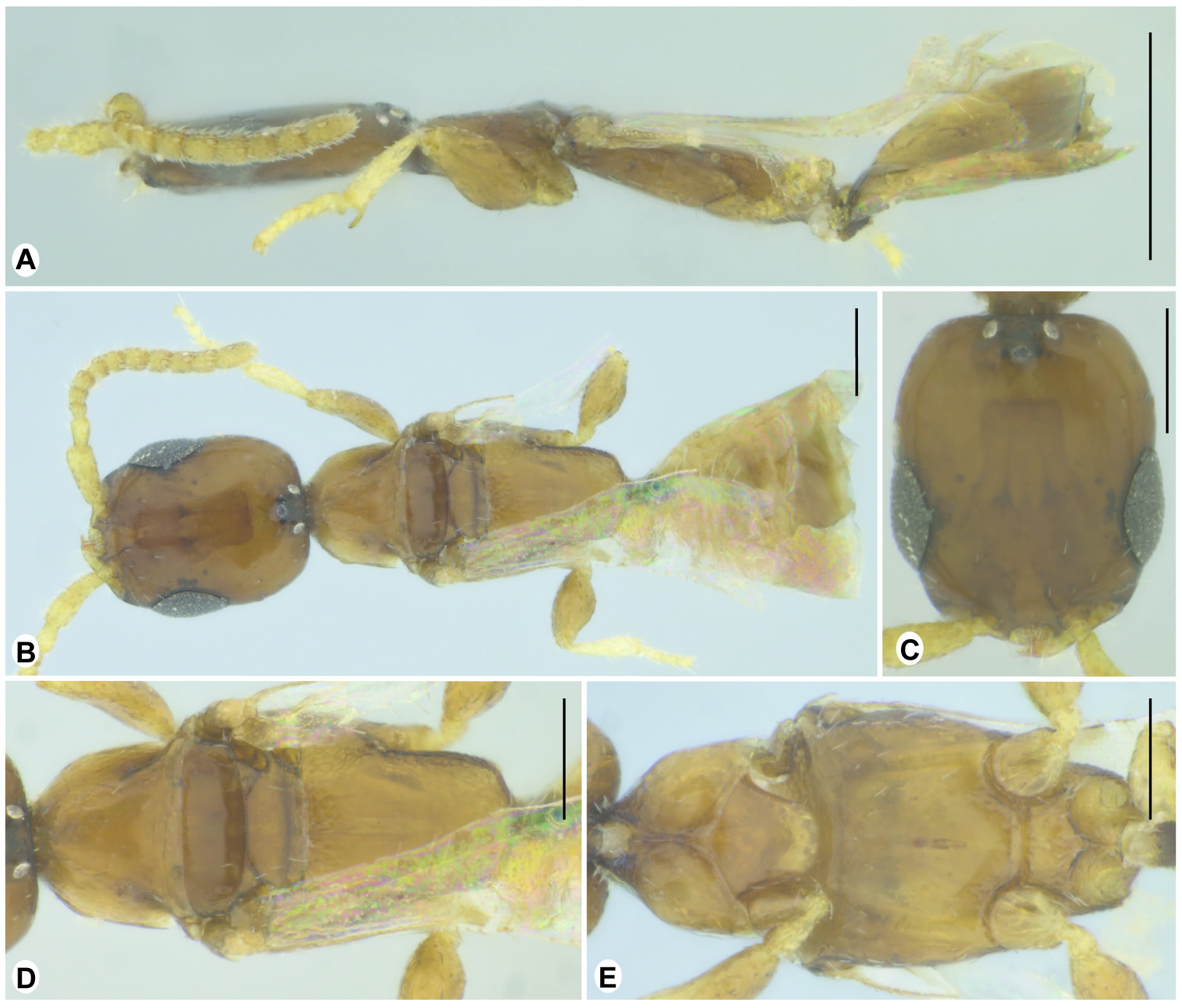 Fig. 3. Megaprosternum bayaka sp. nov., holotype, ♀ (SAMC, SAM-HYM P103670). A–B. Habitus. A. Lateral view. B. Dorsal view. C. Head, dorsal view. D–E. Mesosoma. D. Dorsal view. E. Ventral view. Scale bars: A = 250 μm; B–E = 125 μm.