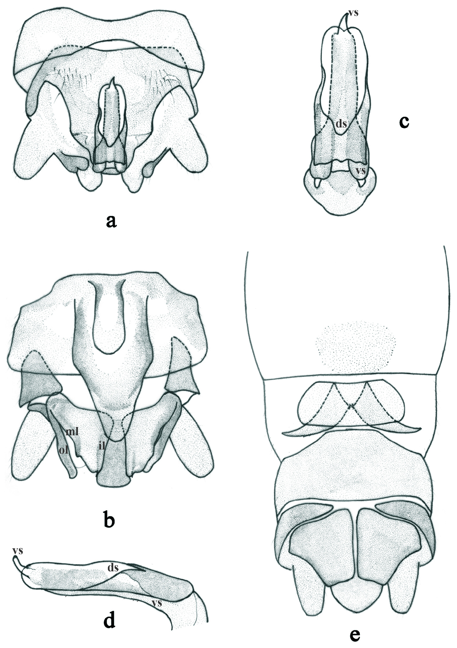 FIGURE 2. Indonemoura sejila sp. nov. (a–d: male, e: female). a: terminalia, dorsal view; b: terminalia, ventral view; c: epiproct, dorsal view; d: epiproct, lateral view; e: abdominalia terminalia, ventral view. il: inner lobe of paraproct, ml: median lobe of paraproct, ol: outer lobe of paraproct, ds: dorsal sclerite, vs: ventral sclerite.