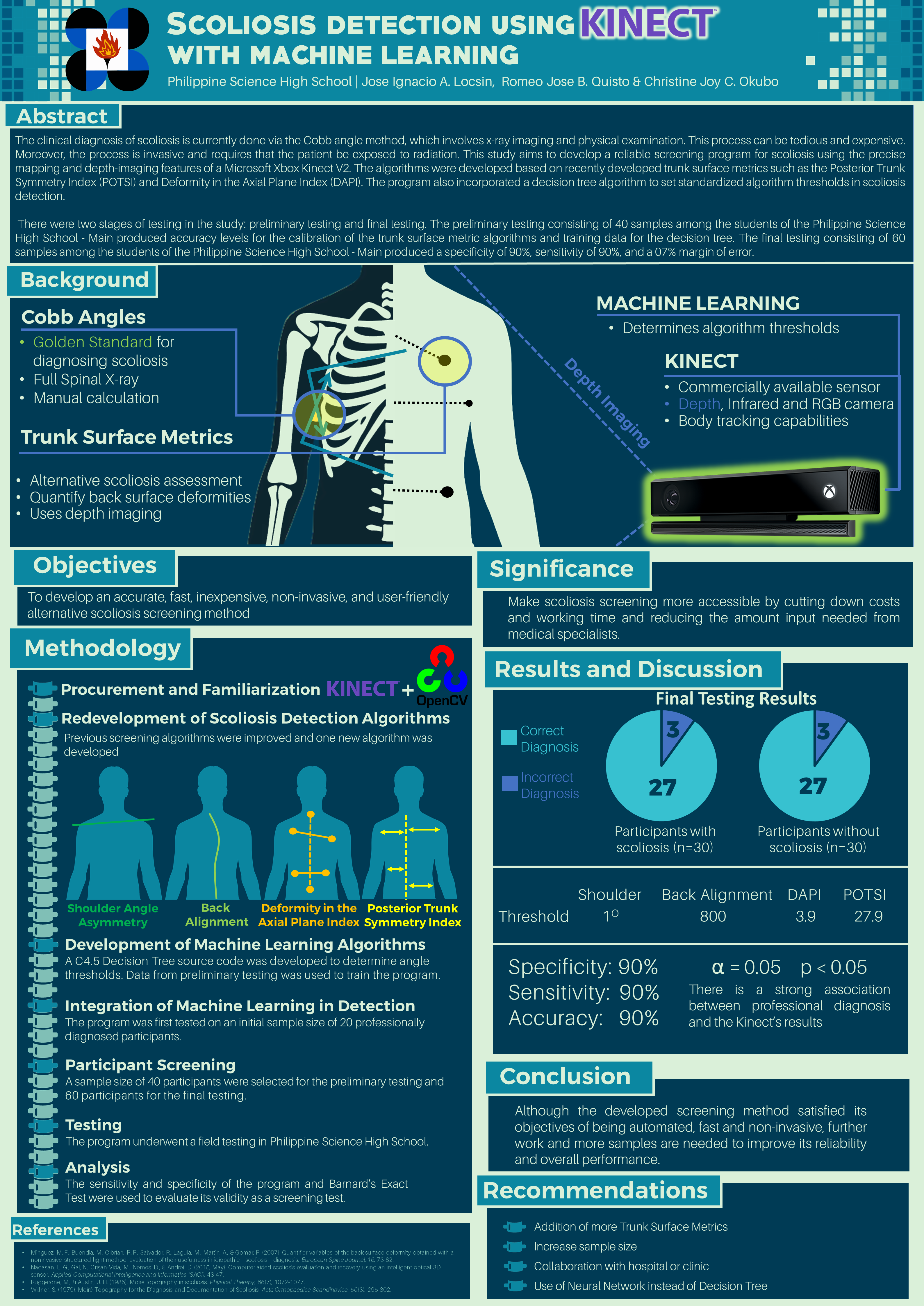 The current clinical standard for scoliosis detection is manual assessment of the Cobb Angle from radiographic images. This method is time-consuming, unaffordable, invasive (subjects the patient to high levels of radiation when done frequently), and not viable for mass screenings. Manually solving for the Cobb Angle is also prone to intra- and inter-observer errors. Using the depth sensing applications of the Microsoft Xbox Kinect and the data processing capabilities of machine learning algorithms, the research aims to develop a scoliosis detection program that is fast, inexpensive, non-invasive, and user-friendly. The detection program made use of four alternative scoliosis assessment algorithms called 'trunk surface metrics' developed in earlier studies, namely the 1) Shoulder Angle Alignment, 2) Body Alignment, 3) Posterior Trunk Symmetry Index, and 4) Deformity in the Axial Plane Index. A decision tree, based on the C4.5 algorithm, for data analysis was developed. A preliminary testing (n = 26) was implemented to calibrate the program and train the decision tree. The final testing on the program (n = 60) then produced a 52.38% mean sensitivity and a 61.11% mean specificity. In conclusion, the results of the study show the potential of using depth-sensing technologies and machine learning algorithms for scoliosis screening and other biomechanical applications.