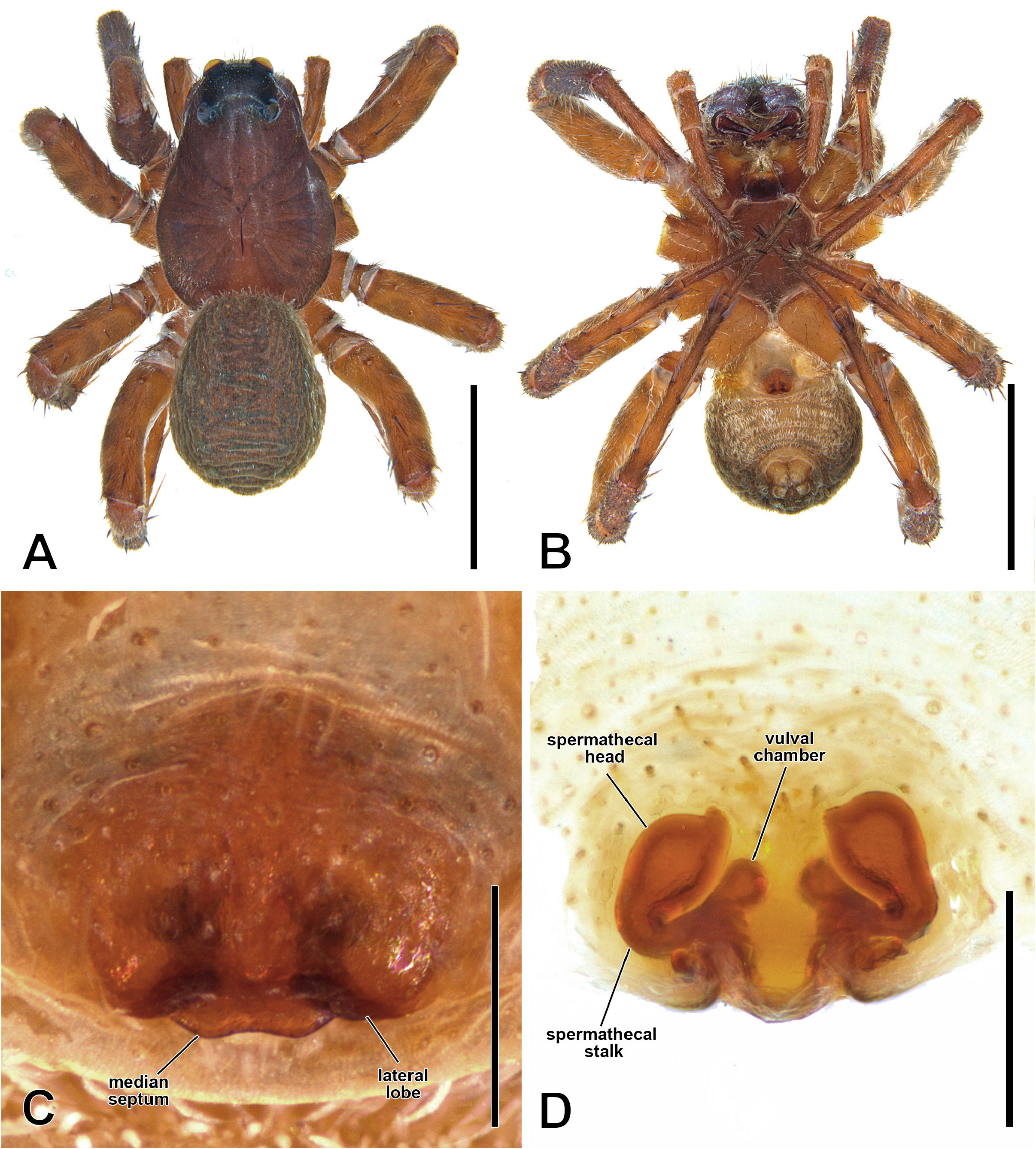 FIGURE 6. Artoria atrata sp. nov., female: A, dorsal habitus; B, ventral habitus; C, epigyne; D, internal genitalia, dorsal view. A–C (WAM T7731); D, (WAM T162515). Scale bars: A, B, 2.0 mm; C, D, 0.2 mm.