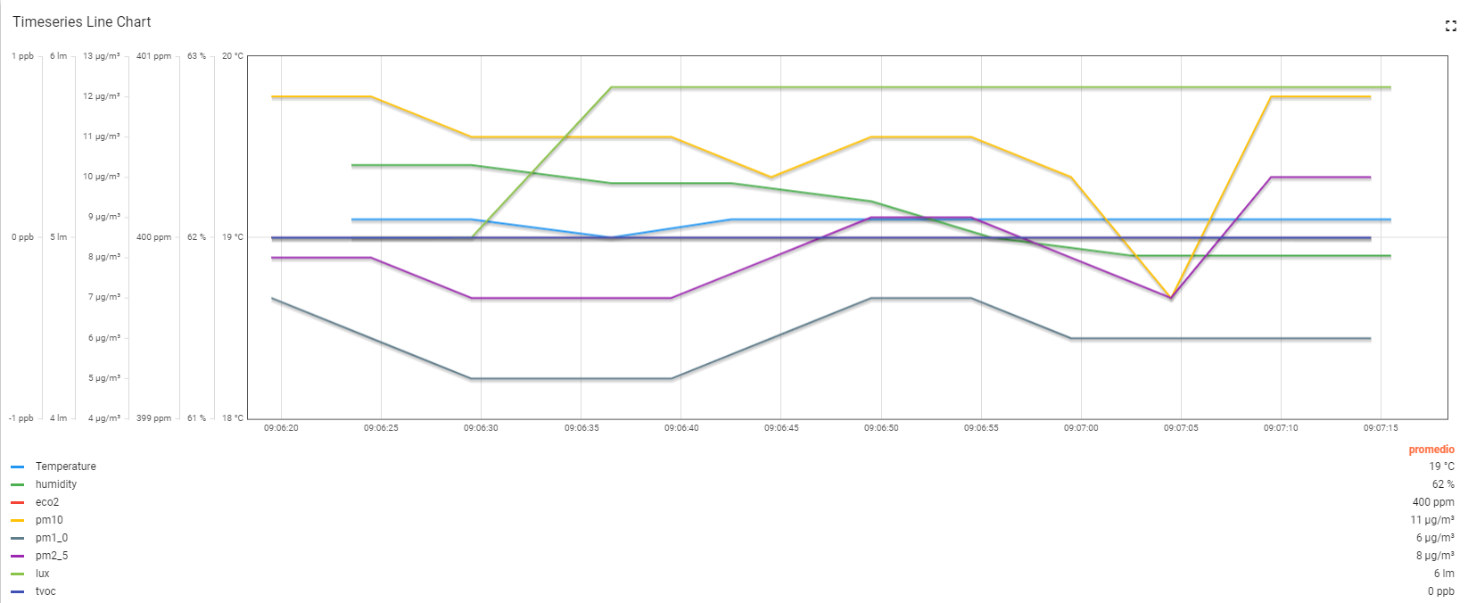 Initial measurements from the recorded data are displayed and tabulated on a dedicated Thingsboard server, as part of a study examining the effects of environmental pollution on student performance. This data was collected in a faculty office of the Computer Science Department (DCI) at the Andrés Bello Campus of UFRO, located in Temuco.