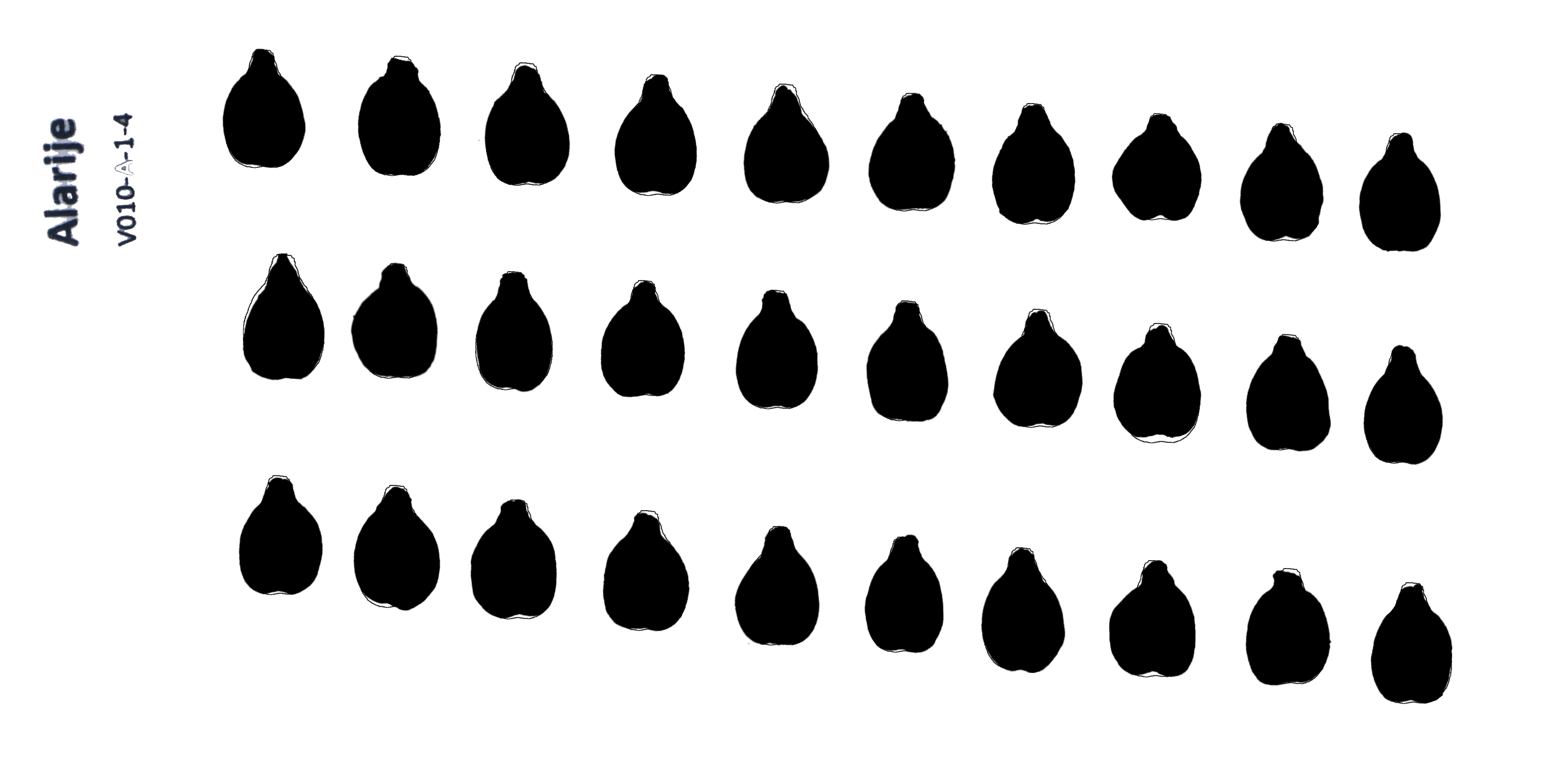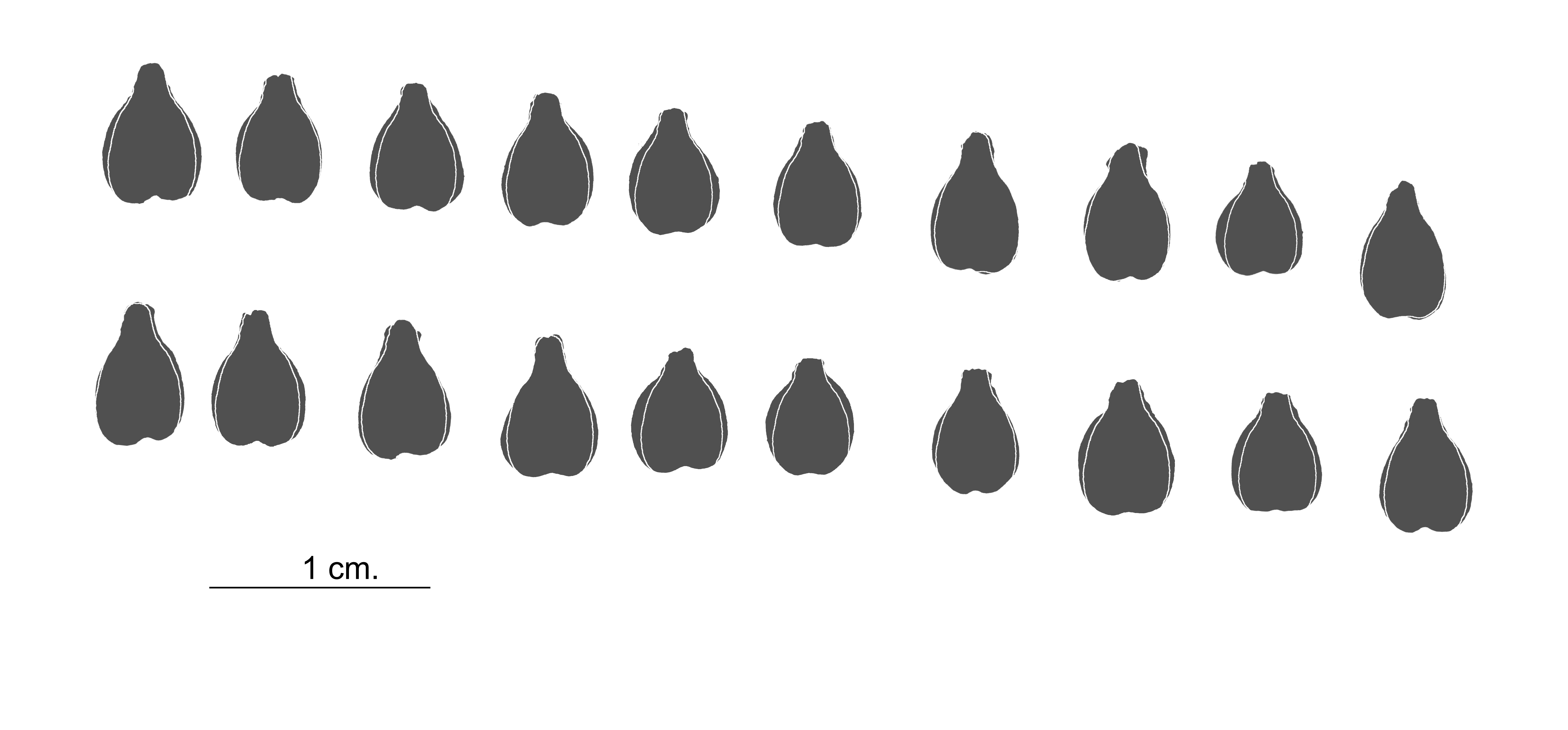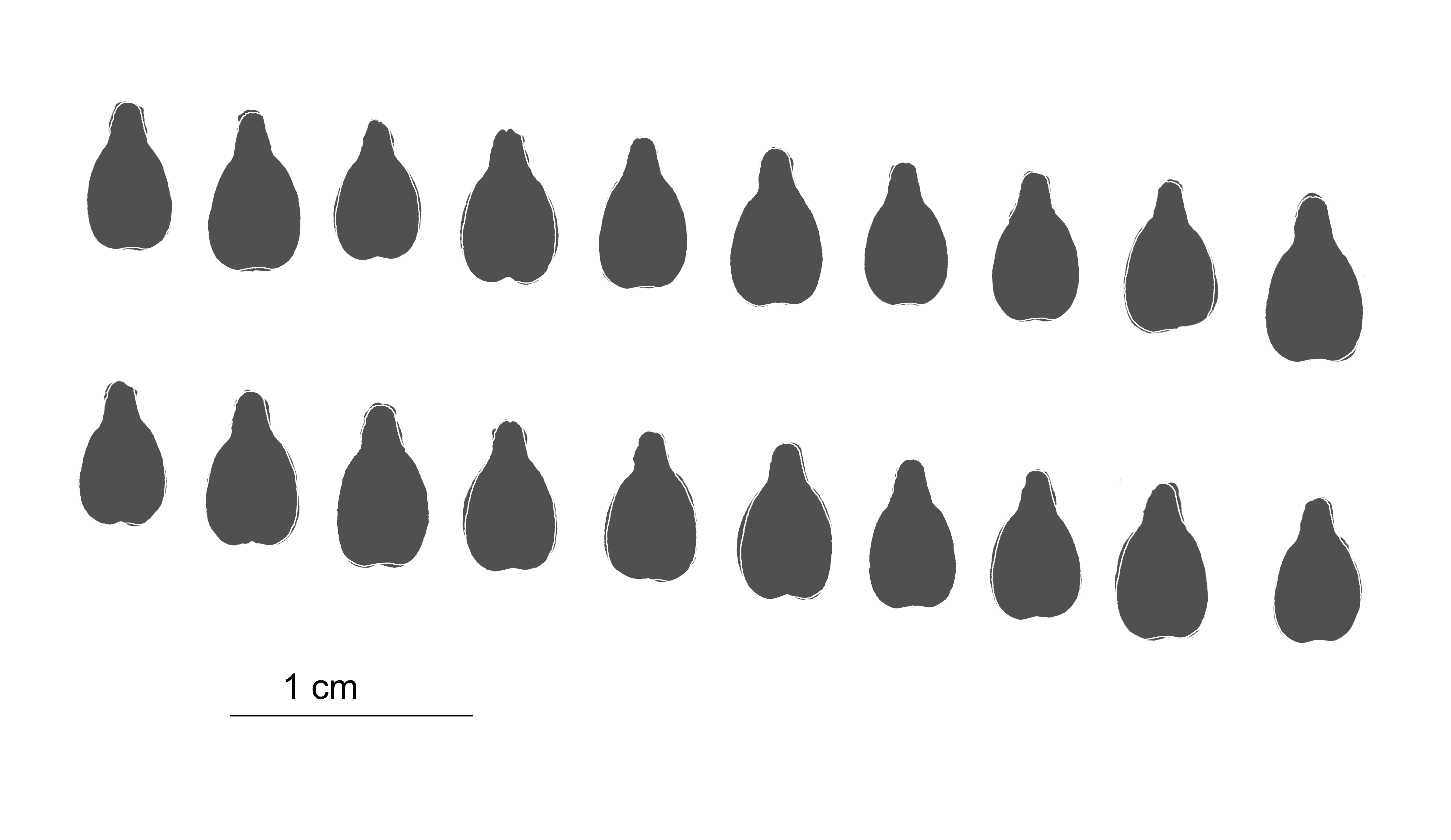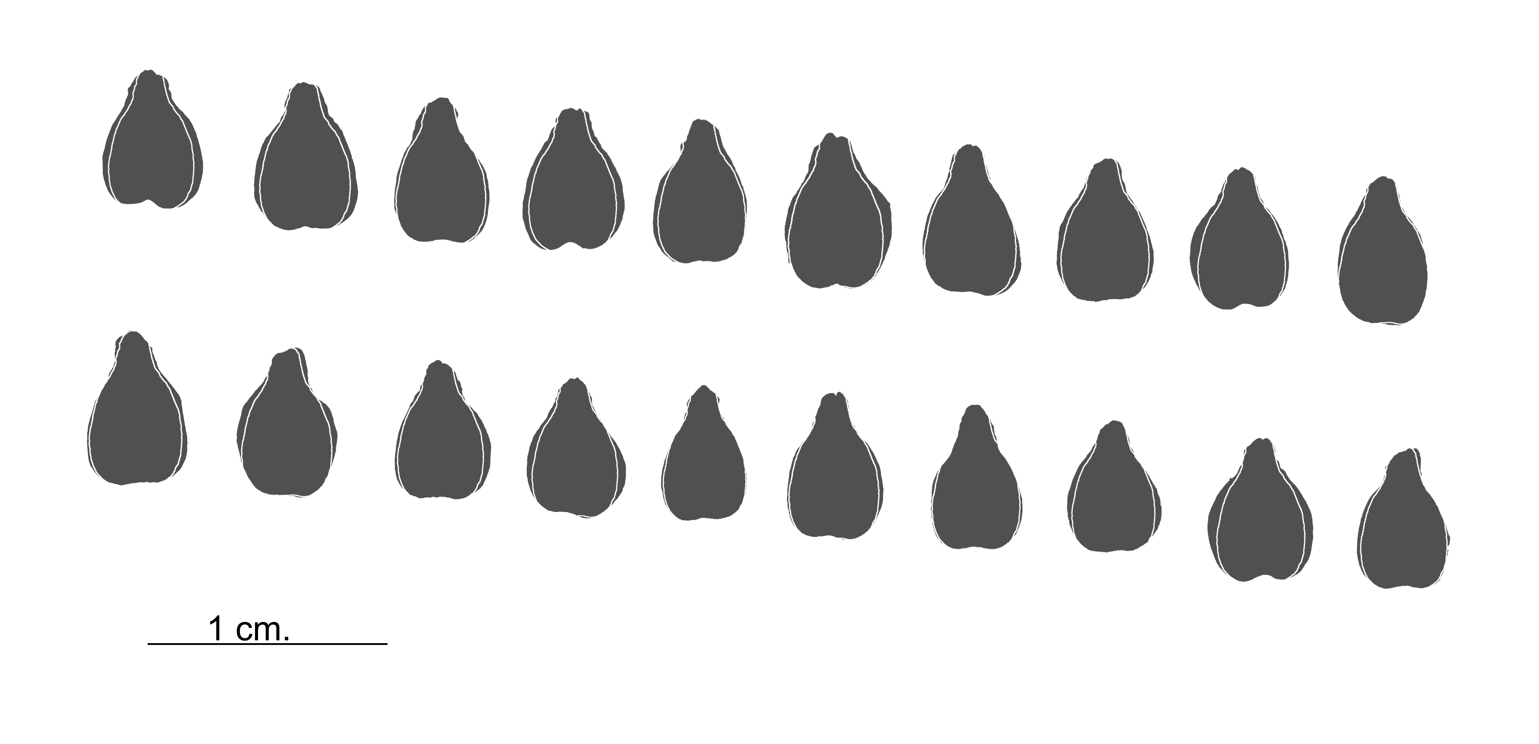 The J-index is the percent of similarity between the seed image and a geometric model. It is calculated by comparing two images: the seed image and the model. For this, the models are superimposed on images of 20 seeds of each cultivar, looking for maximum similarity. The models are overlaid on Adobe Photoshop files (PSD; Photoshop CC 2020; Adobe, San Jose, CA, USA) containing twenty seeds of each cultivar, and two new files are saved for each of these images: one with the model in black and one with the model in white. The Image J program provides for each of these images the values of total area (T, being the silhouette of the model in black, the whole area is considered) and area shared between the model and the seeds (S, being the silhouette of the model in white, the measured area is limited to the area shared between the seed and the model). Note that "T" is the total surface occupied by either the seed or the model, whereas in "S" the measured surface is shortened by the white profile of the model. For each seed the J-index is calculated as the ratio S/T. For each variety, the J-index is the mean value of its 20 (or 30) seeds.