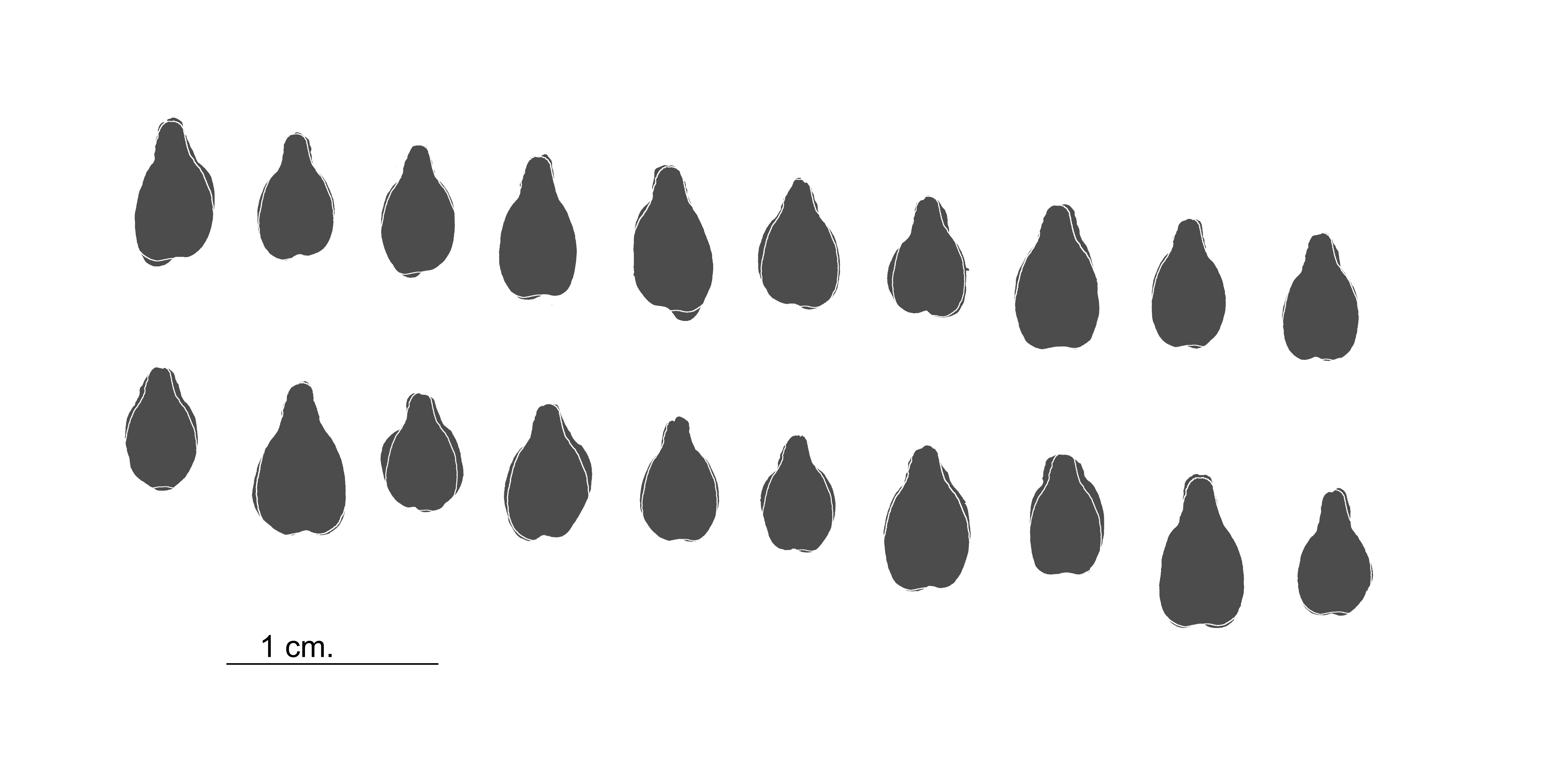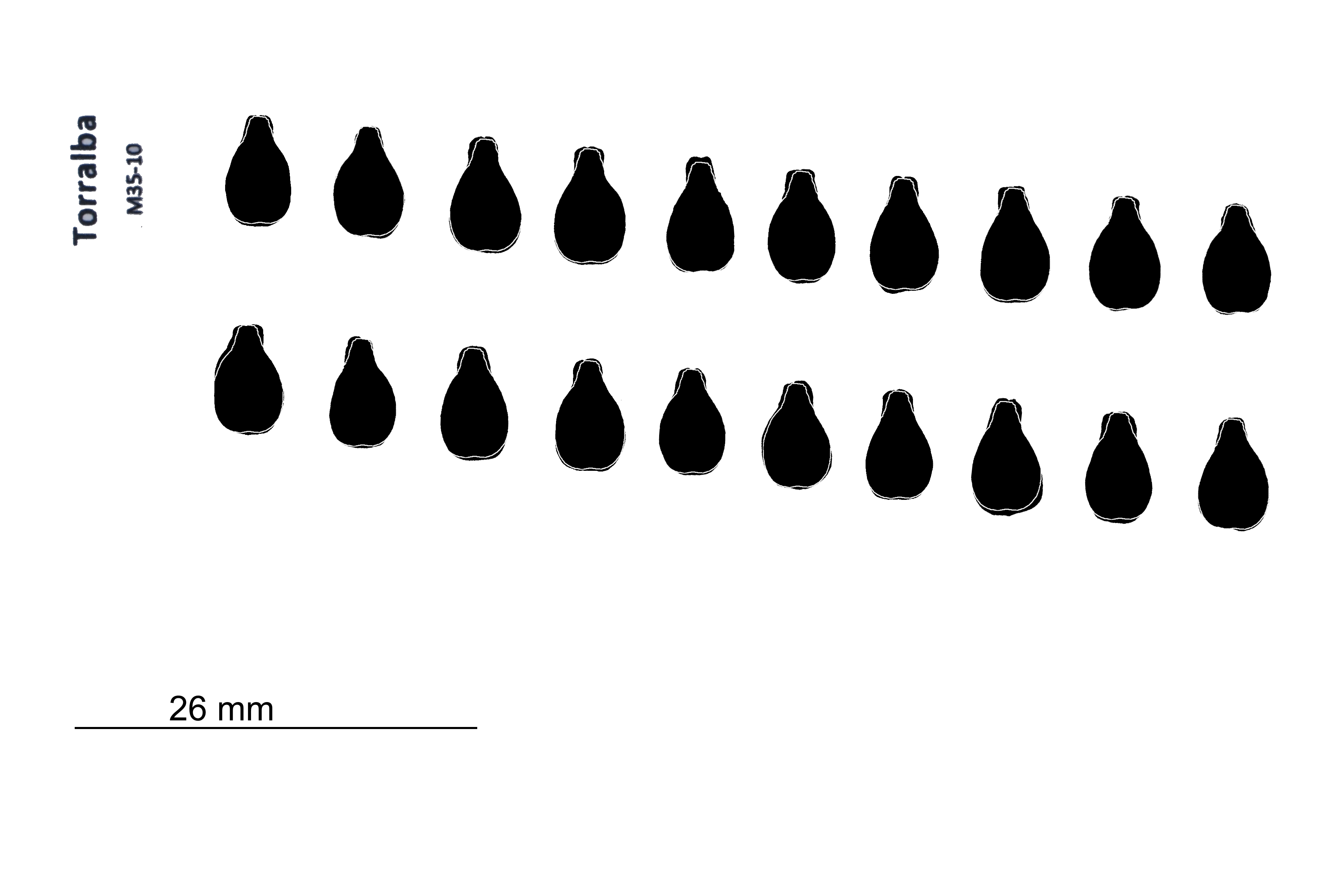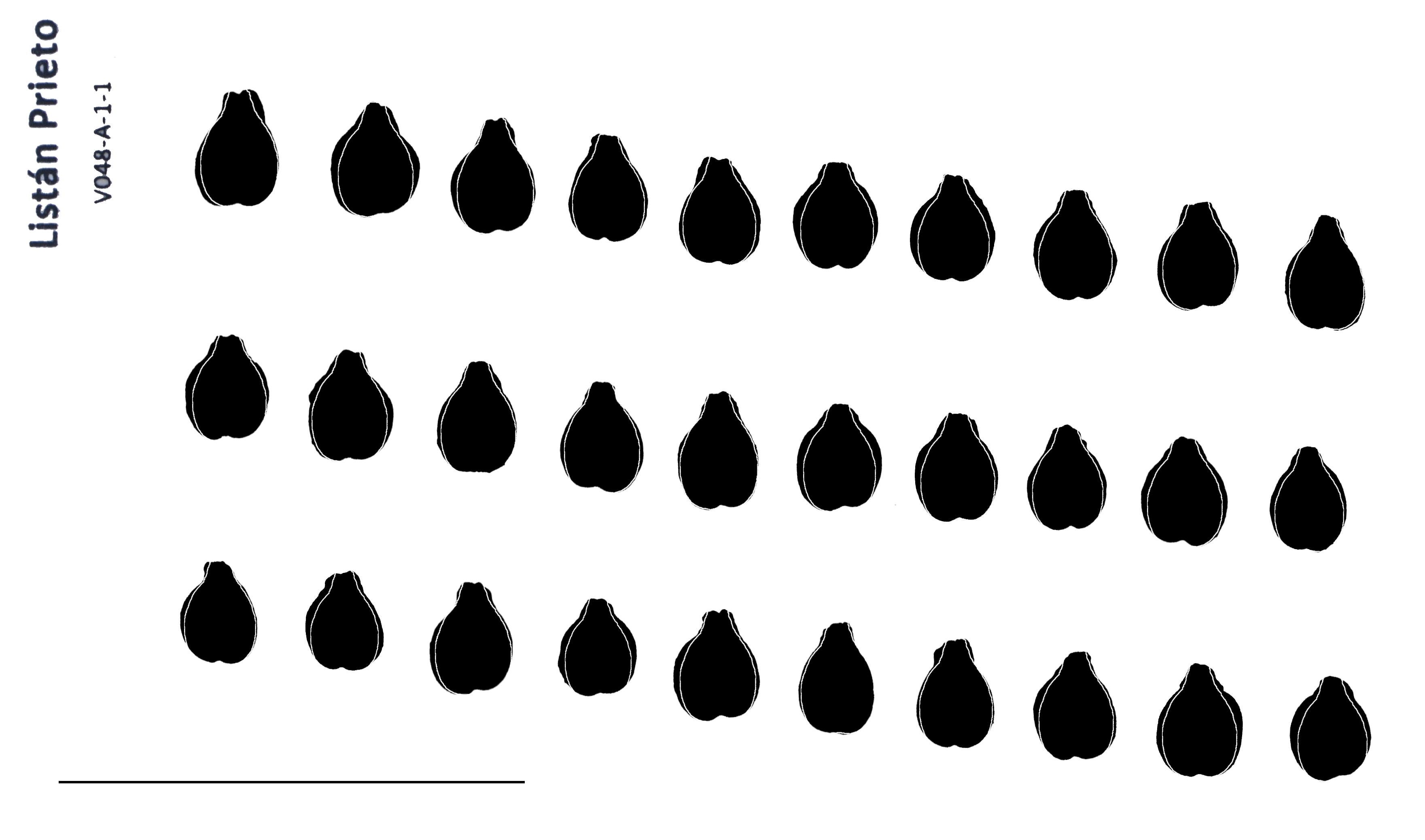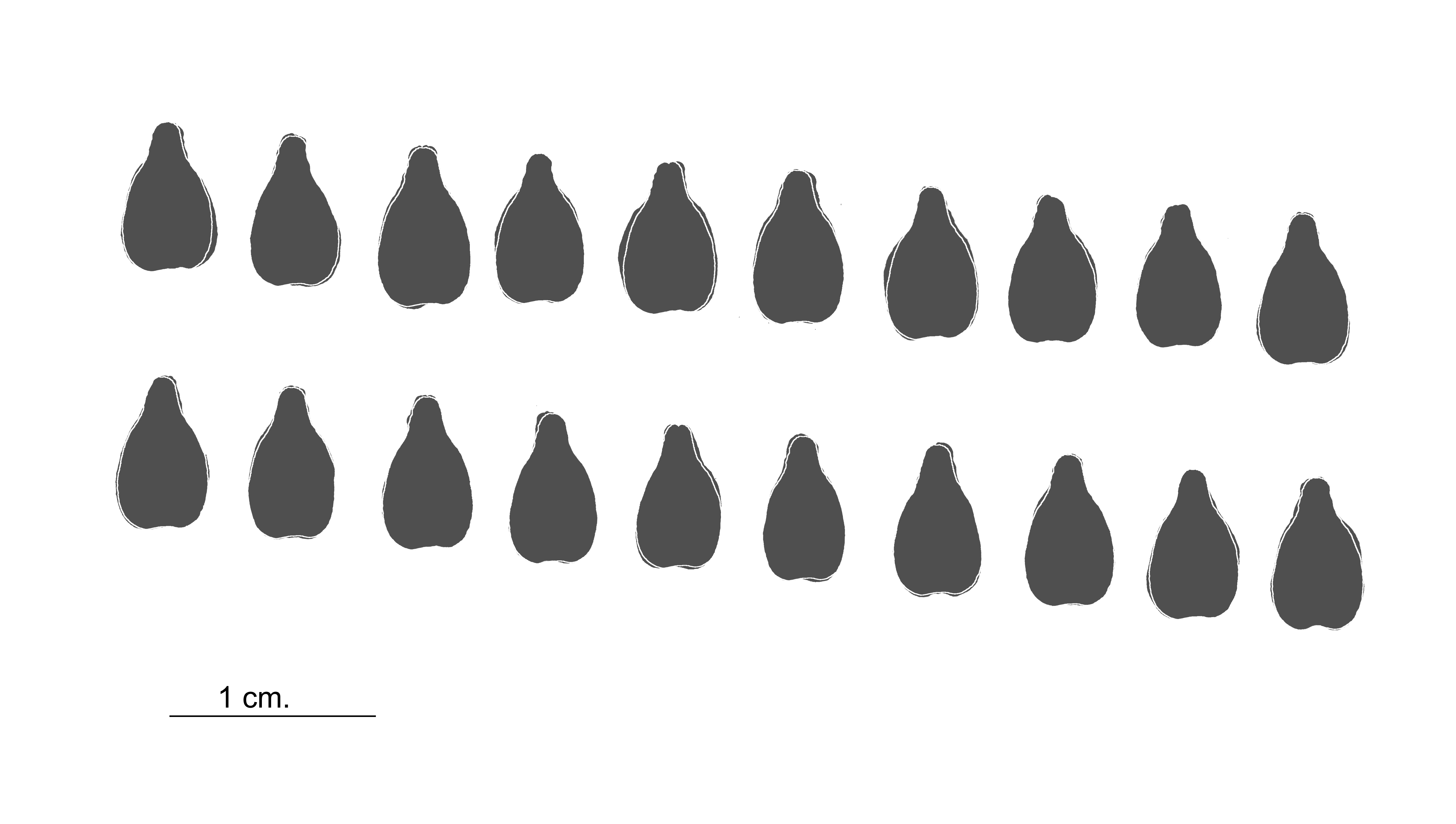 The J-index is the percent of similarity between the seed image and a geometric model. It is calculated by comparing two images: the seed image and the model. For this, the models are superimposed on images of 20 seeds of each cultivar, looking for maximum similarity. The models are overlaid on Adobe Photoshop files (PSD; Photoshop CC 2020; Adobe, San Jose, CA, USA) containing twenty seeds of each cultivar, and two new files are saved for each of these images: one with the model in black and one with the model in white. The Image J program provides for each of these images the values of total area (T, being the silhouette of the model in black, the whole area is considered) and area shared between the model and the seeds (S, being the silhouette of the model in white, the measured area is limited to the area shared between the seed and the model). Note that "T" is the total surface occupied by either the seed or the model, whereas in "S" the measured surface is shortened by the white profile of the model. For each seed the J-index is calculated as the ratio S/T. For each variety, the J-index is the mean value of its 20 (or 30) seeds.