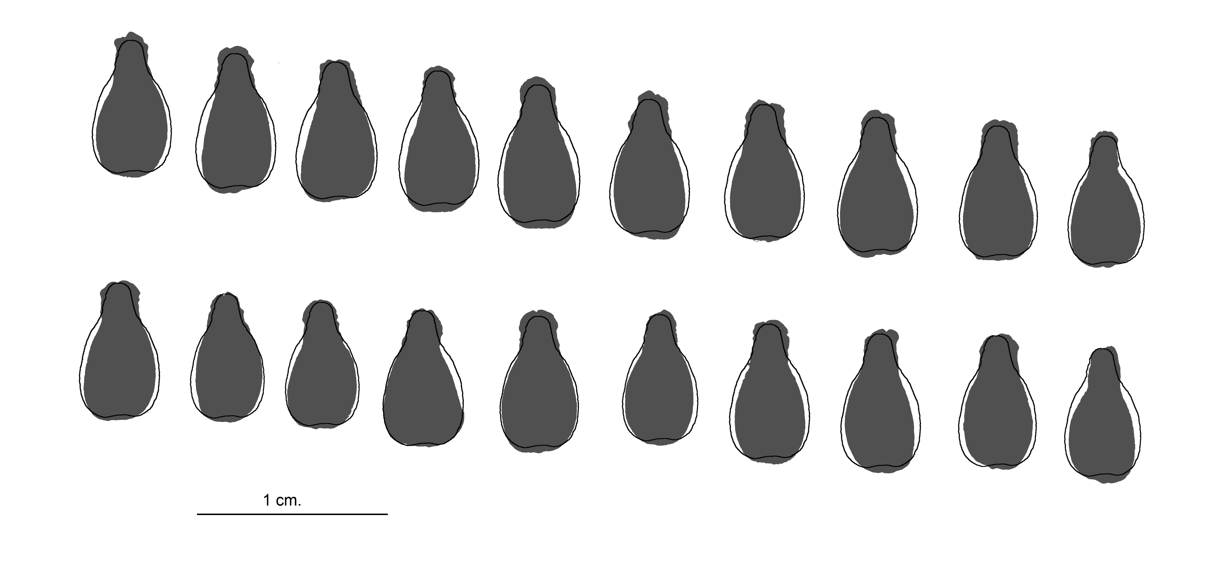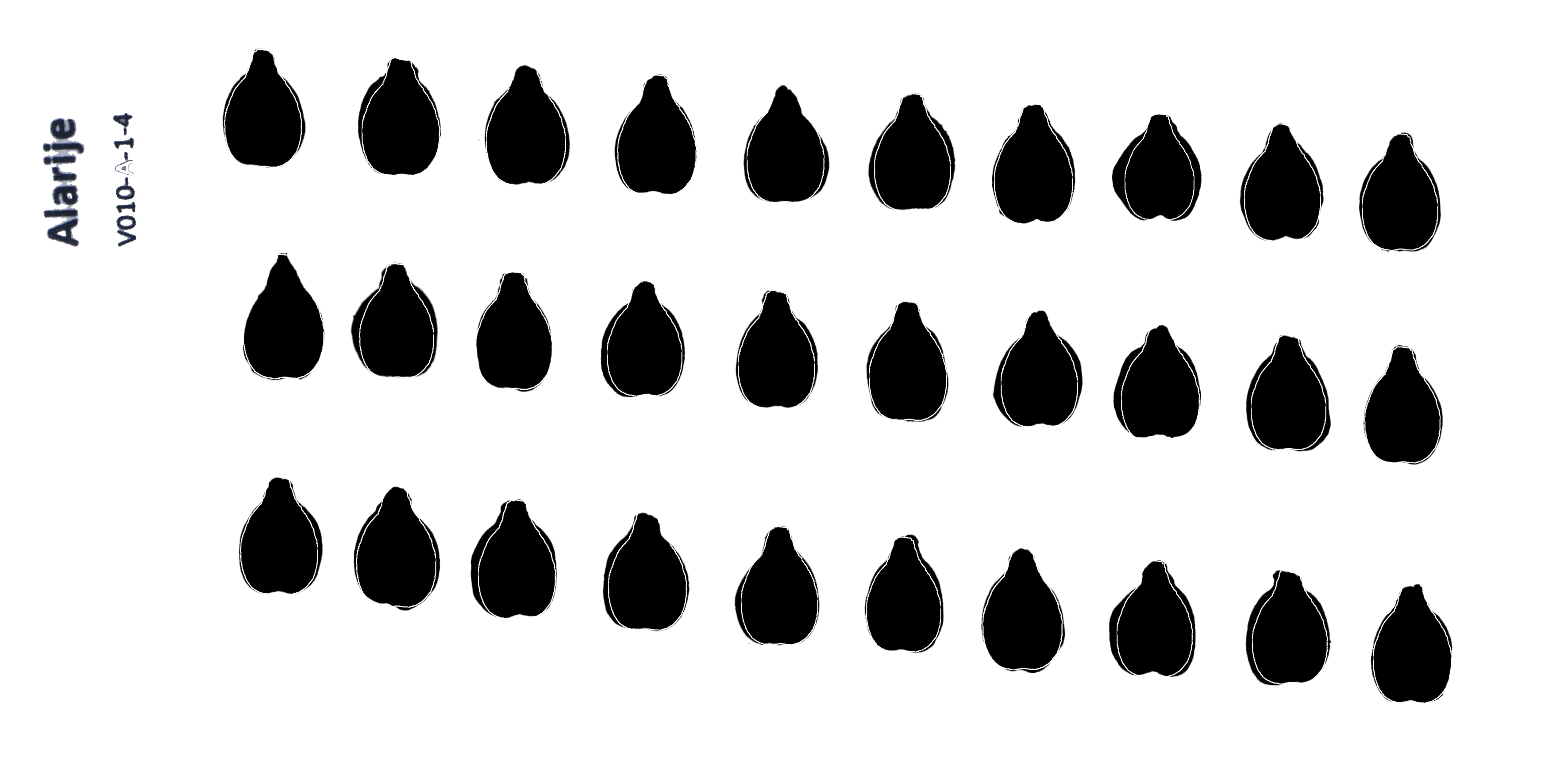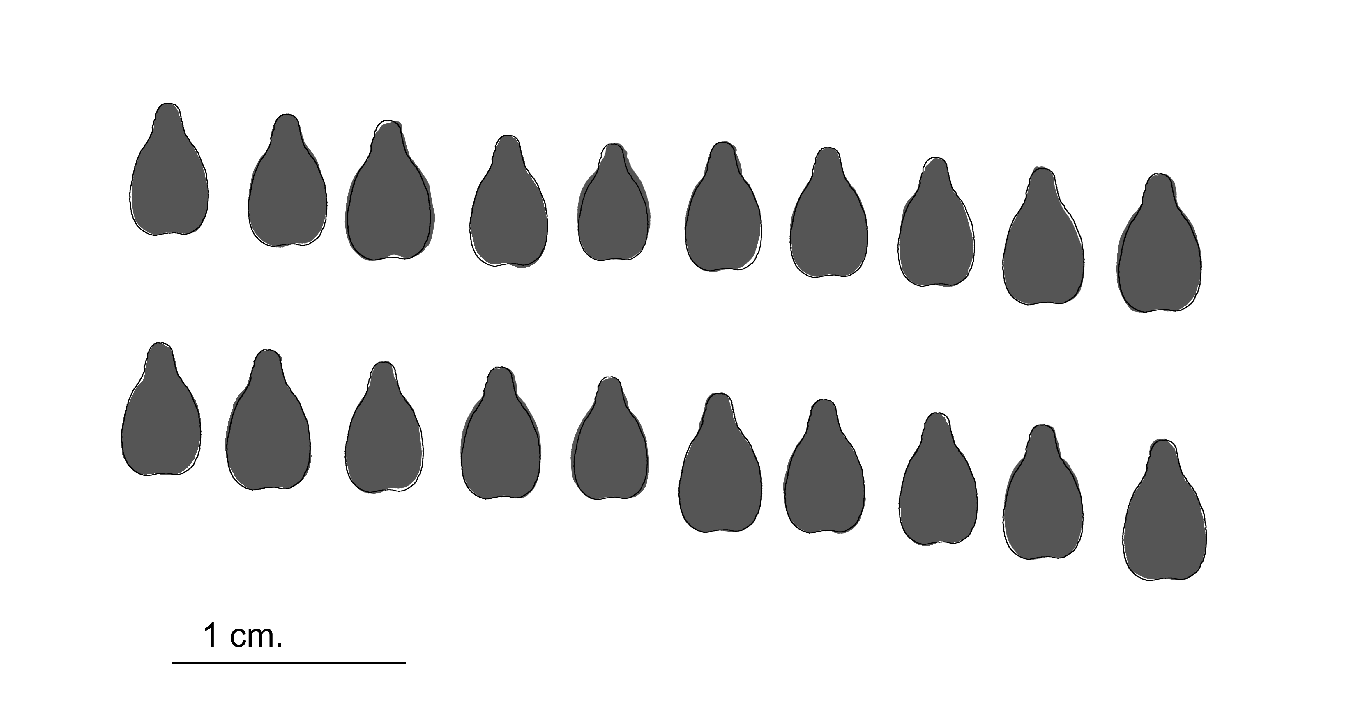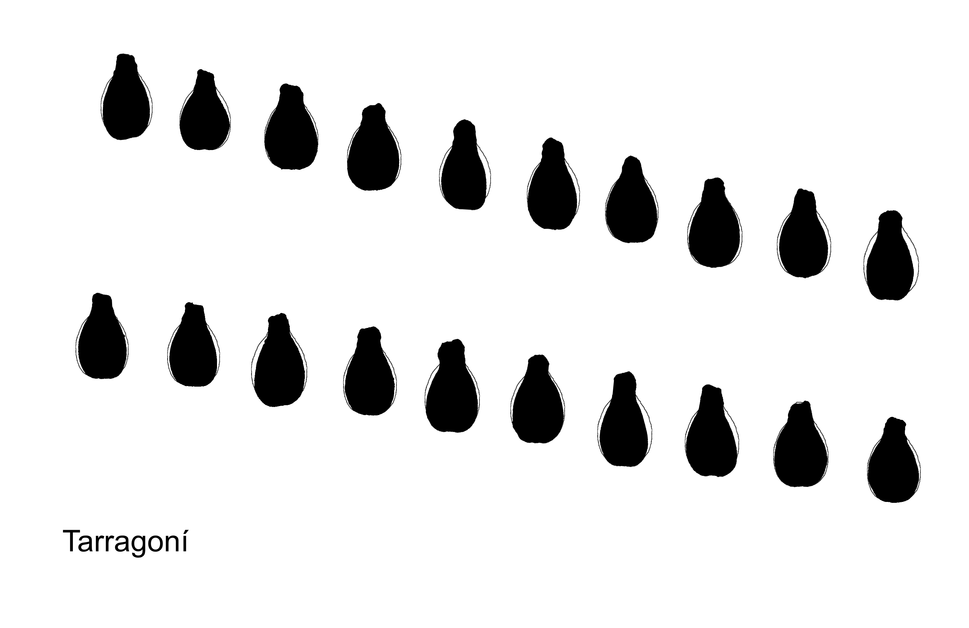 The J-index is the percent of similarity between the seed image and a geometric model. It is calculated by comparing two images: the seed image and the model. For this, the models are superimposed on images of 20 seeds of each cultivar, looking for maximum similarity. The models are overlaid on Adobe Photoshop files (PSD; Photoshop CC 2020; Adobe, San Jose, CA, USA) containing twenty seeds of each cultivar, and two new files are saved for each of these images: one with the model in black and one with the model in white. The Image J program provides for each of these images the values of total area (T, being the silhouette of the model in black, the whole area is considered) and area shared between the model and the seeds (S, being the silhouette of the model in white, the measured area is limited to the area shared between the seed and the model). Note that "T" is the total surface occupied by either the seed or the model, whereas in "S" the measured surface is shortened by the white profile of the model. For each seed the J-index is calculated as the ratio S/T. For each variety, the J-index is the mean value of its 20 (or 30) seeds.
